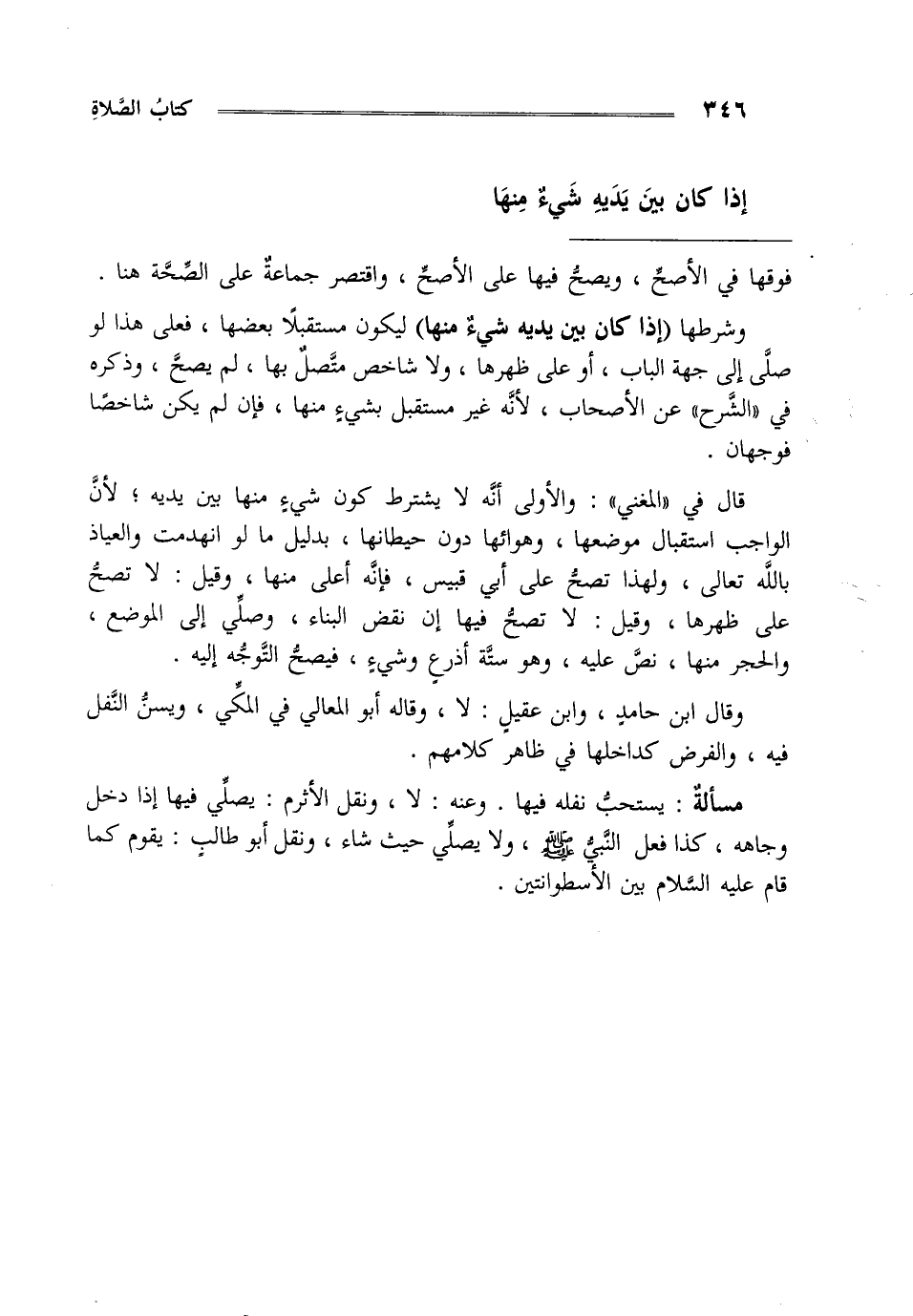 وشرطها "إذا كان بين يديه شيء منها" ليكون مستقبلا بعضها فعلى هذا لو صلى إلى جهة الباب أو على ظهرها ولا شاخص متصل بها لم يصح وذكره في الشرح عن الأصحاب لأنه غير مستقبل بشيء منها فإن لم يكن شاخصا فوجهان.
