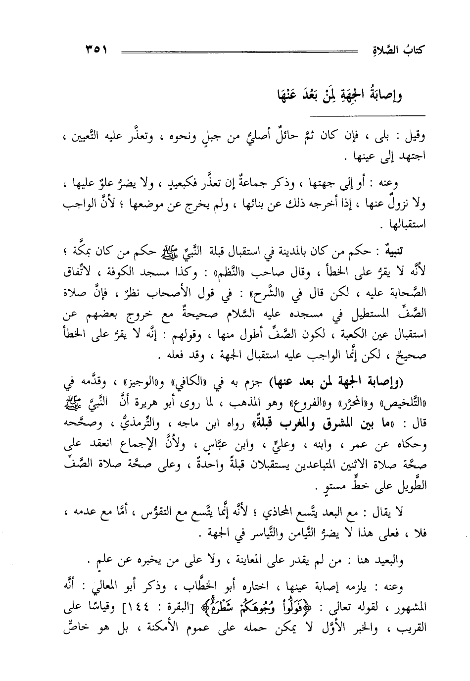 "وإصابة الجهة لمن بعد عنها" جزم به في الكافي و الوجيز وقدمه في التلخيص و المحرر و الفروع وهو المذهب لما روى أبو هريرة أن النبي صلى الله عليه وسلم قال: " ما بين المشرق والمغرب قبلة" رواه ابن ماجة والترمذي وصححه وحكاه عن عمر وابنه وعلي وابن عباس ولأن الإجماع انعقد على صحة صلاة الأثنين المتباعدين يستقبلان قبلة واحدة وعلى صحة صلاة الصف الطويل على خط مستو.