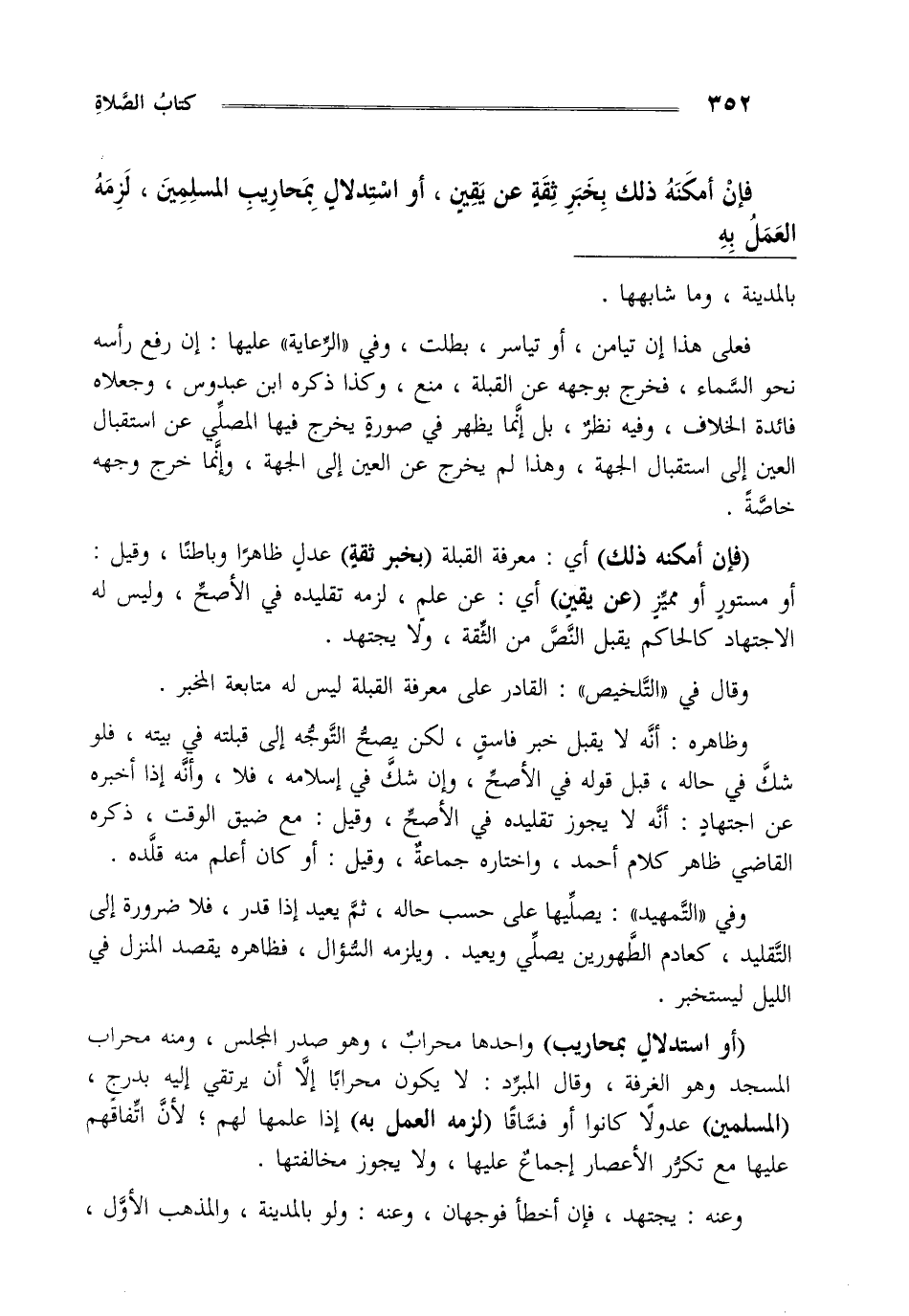 "أو استدلال بمحاريب" واحدها محراب وهو صدر المجلس ومنه محراب المسجد وهو الغرفة وقال المبرد لا يكون محرابا إلا أن يرتقي إليه بدرج المسلمين عدولا كانوا أو فساقا "لزمه العمل به" إذا علمها لهم لأن اتفاقهم عليها مع تكرر الأعصار إجماع عليها ولا يجوز مخالفتها.