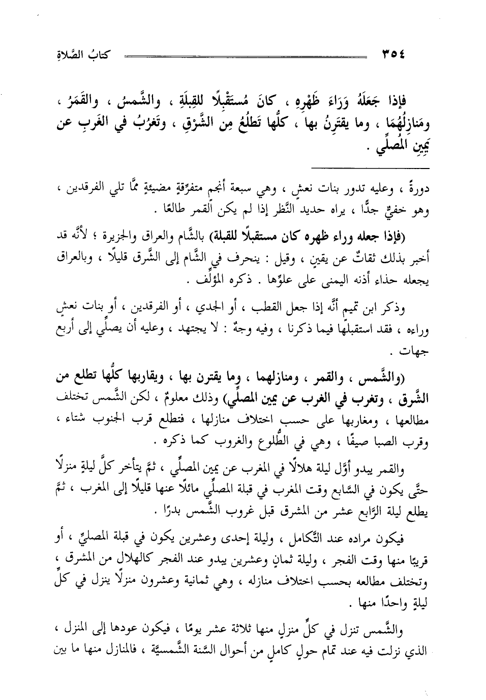 "والشمس والقمر ومنازلهما وما يقترن بها ويقاربها كلها تطلع من الشرق وتغرب في الغرب عن يمين المصلي" وذلك معلوم لكن الشمس تختلف مطالعها ومغاربها على حسب اختلاف منازلها فتطلع قرب الجنوب شتاء وقرب الصبا صيفا وهي في الطلوع والغروب كما ذكره.