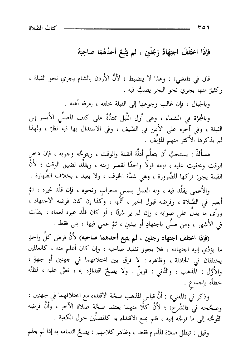 "فإذا اختلف اجتهاد رجلين لم يتبع أحدهما صاحبه" لأن فرض كل واحد ما يؤدي إليه اجتهاده فلا يجوز تقليد صاحبه وإن كان أعلم منه كالعالمين يختلفان في الحادثة وظاهره لا فرق بين اختلافهما في جهتين أو جهة والأول المذهب والثاني قويل ولا يصح اقتداؤه به نص عليه لظنه خطأه بإجماع.