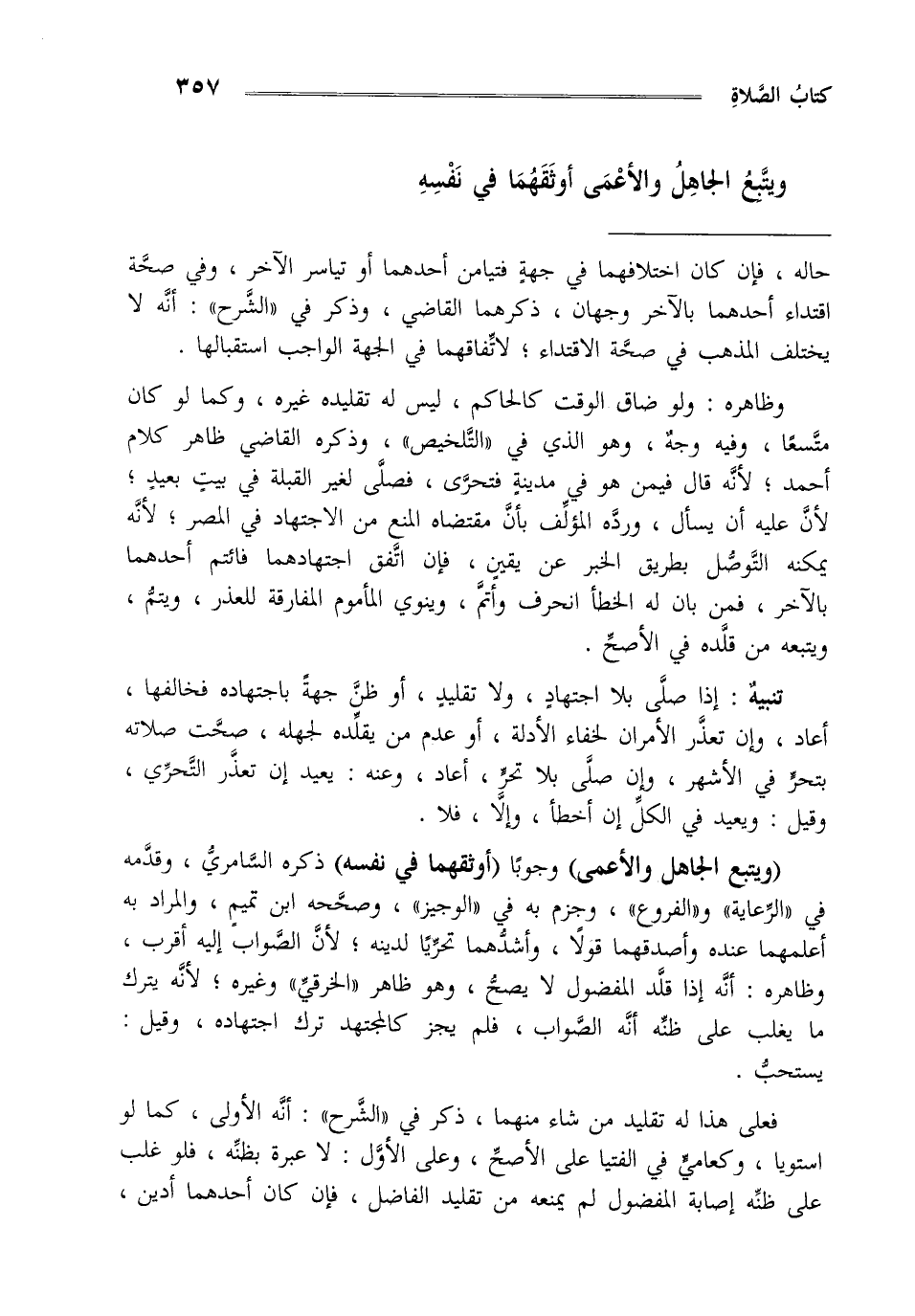"ويتبع الجاهل والأعمى" وجوبا "أوثقهما في نفسه" ذكره السامري وقدمه في الرعاية و الفروع وجزم به في الوجيز وصححه ابن تميم والمراد به أعلمها عنده وأصدقهما قولا وأشدهما تحريا لدينه لأن الصواب إليه أقرب وظاهره أنه إذا قلد المفضول لا يصح وهو ظاهر الخرقي وغيره لأنه يترك ما يغلب على ظنه أنه الصواب فلم يجز كالمجتهد ترك اجتهاده وقيل يستحب.