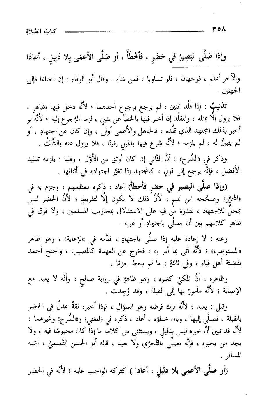 "وإذا صلى البصير في حضر فأخطأ" أعاد ذكره معظمهم وجزم به في المحرر وصححه ابن تميم لأن ذلك لا يكون إلا لتفريط لأن الحضر ليس بمحل للاجتهاد لقدرة من فيه على الاستدلال بمحاريب المسلمين ولا فرق في ظاهر كلامهم بين أن يصلي باجتهاد أو غيره.