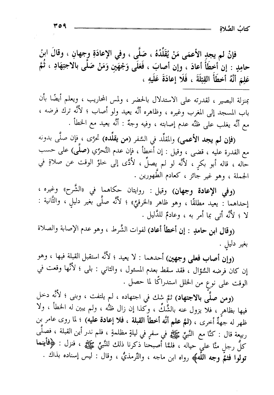 فإن لم يجد الأعمى من يقلده صلى وفي الإعادة وجهان وقال ابن حامد إن أخطأ أعاد وإن أصاب فعلى وجهين ومن صلى بالاجتهاد ثم علم أنه أخطأ القبلة فلا إعادة عليه،
