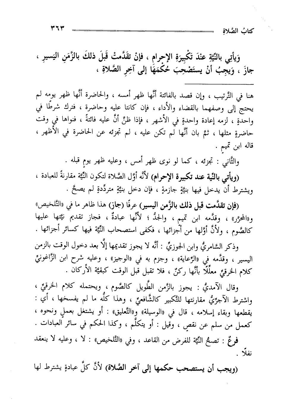 "فإن تقدمت قبل ذلك بالزمن اليسير" عرفا "جاز" هذا ظاهر ما في التلخيص و المحرر وقدمه ابن تميم والجد لأنها عبادة فجاز تقديم نيتها عليها كالصوم ولأن أولها من أجزائها فكفى استصحاب النية فيها كسائر أجزائها.