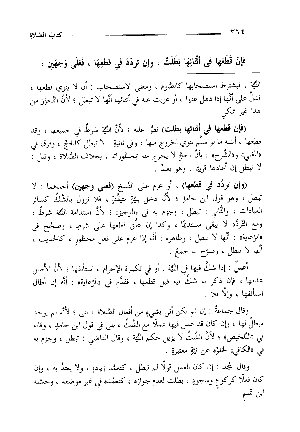 "وإن تردد في قطعها" أو عزم على النسخ "فعلى وجهين" أحدهما لا تبطل وهو قول ابن حامد لأنه دخل بنية متيقنة فلا تزول بالشك كسائر العبادات والثاني تبطل وجزم به في الوجيز لأن استدامة النية شرط ومع التردد لا يبقى مستديما وكذا إن علق قطعها على شرط بكذا في الرعاية أنها لا تبطل وظاهره أنه إذا عزم على فعل محظور كالحديث أنها لا تبطل وصرح به جمع.