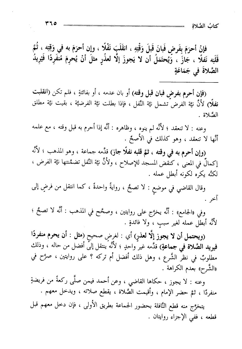 فإن أحرم بفرض فبان قبل وقته انقلبت نفلا وإن أحرم به في وقته ثم قلبه نفلا جاز ويحتمل أن لا يجوز إلا لعذر مثل أن يحرم منفردا فيريد الصلاة في جماعة