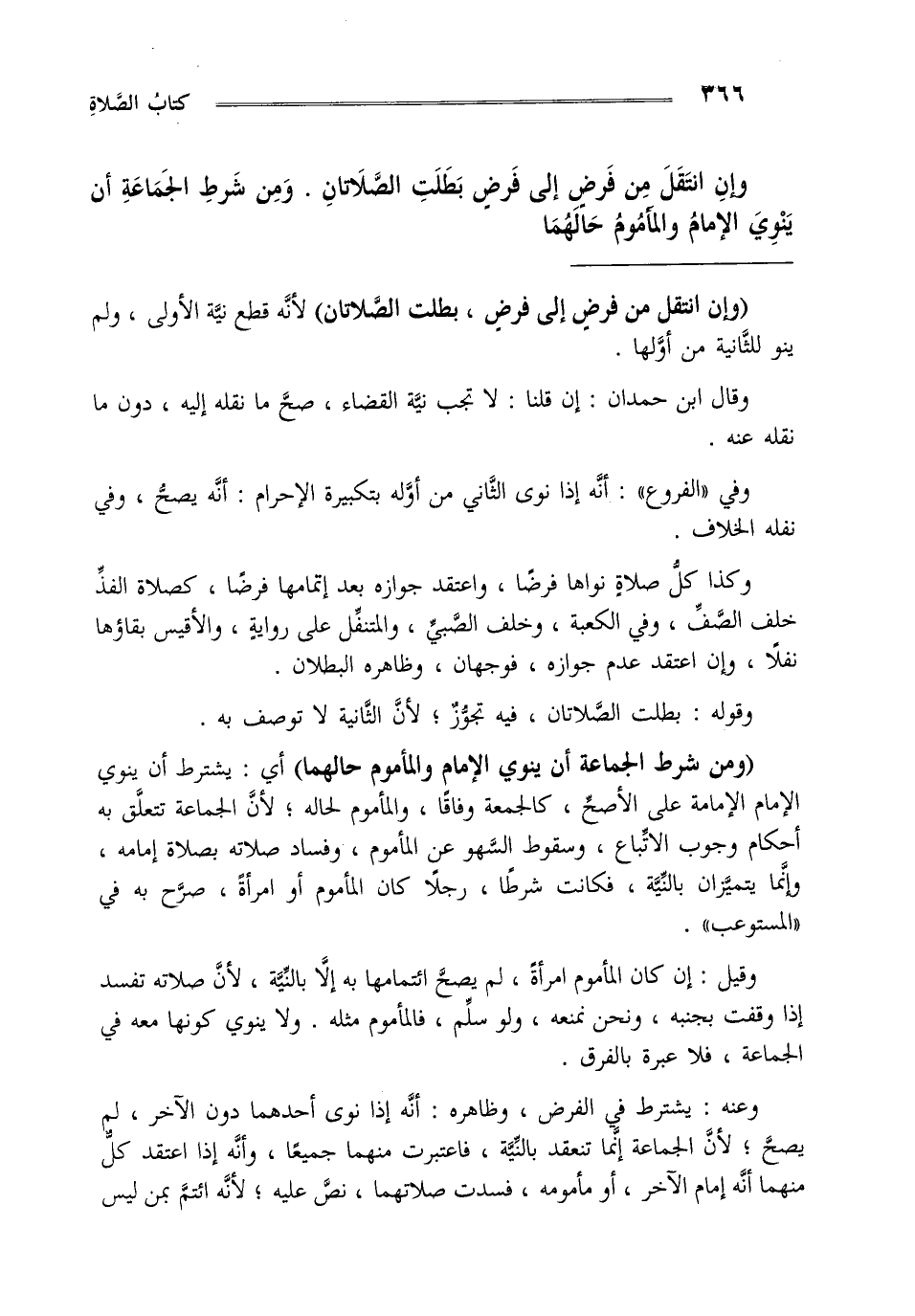 وإن انتقل من فرض إلى فرض بطلت الصلاتان ومن شرط الجماعة أن ينوي الإمام والمأموم حالهما