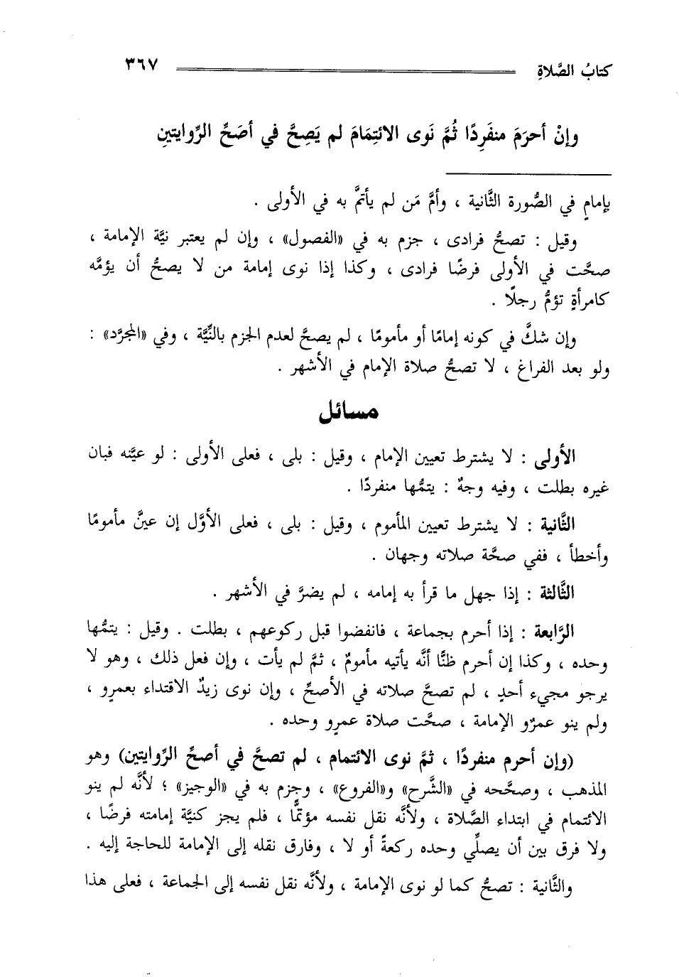 الرابعة : إذا أحرم بجماعة فانفضوا قبل ركوعهم بطلت وقيل يتمها وحده وكذا إن أحرم ظنا أنه يأتيه مأموم ثم لم يأت وإن فعل ذلك وهو لا يرجو مجيء أحد لم تصح صلاته في الأصح وإن نوى زيد الاقتداء بعمرو ولم ينو عمرو الإمامة صحت صلاة عمرو وحده.