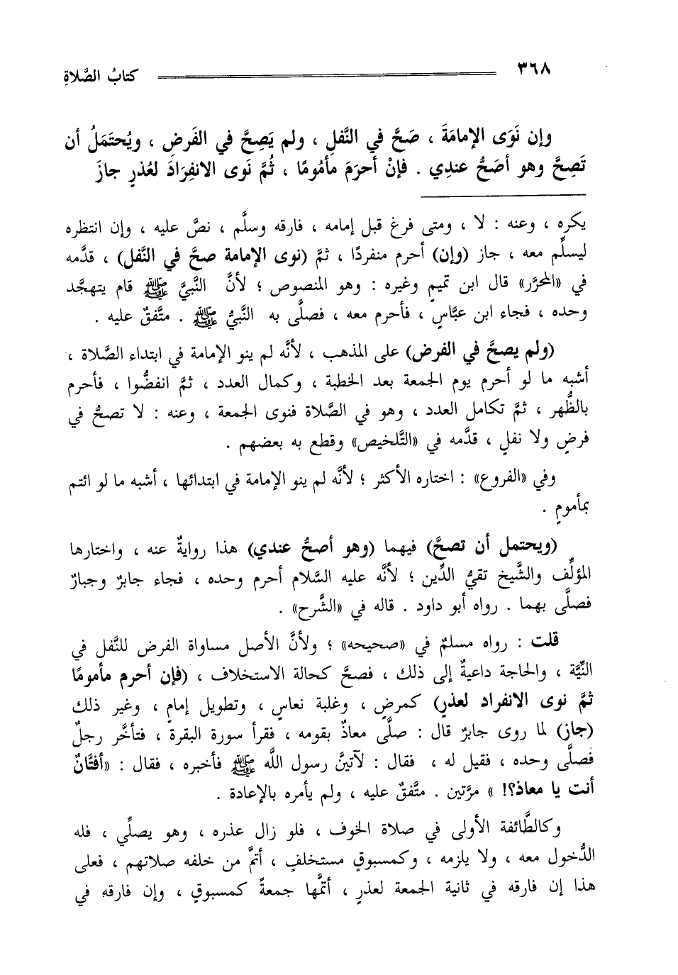 قلت: رواه مسلم في صحيحه ولأن الأصل مساواة الفرض للنفل في النية والحاجة داعية إلى ذلك فصح كحالة الاستخلاف "فإن أحرم مأموما ثم نوى الانفراد لعذر" كمرض وغلبة نعاس وتطويل إمام وغير ذلك جاز لما روى جابر قال "صلى معاذ بقومه فقرأ سورة البقرة فتأخر رجل فصلى وحده فقيل له فقال لآتين رسول الله صلى الله عليه وسلم فأخبره فقال أفتان أنت يا معاذ مرتين" متفق عليه ولم يأمره بالإعادة.