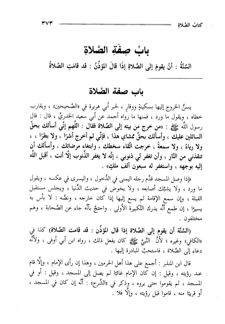 يسن الخروج إليها بسكينة ووقار لخبر أبي هريرة في الصحيحين ويقارب خطاه ويقول ما ورد فمنها ما رواه أحمد عن أبي سعيد الخدري قال قال رسول الله صلى الله عليه وسلم: "من خرج من بيته إلى الصلاة فقال اللهم إني أسألك بحق السائلين عليك وأسألك بحق ممشاي هذا فإني لم أخرج أشرا ولا بطرا ولا رياء ولا سمعة خرجت اتقاء سخطك وابتغاء مرضاتك وأسألك أن تنقذني من النار وأن تغفر لي ذنوبي إنه لا يغفر الذنوب إلا أنت أقبل الله إليه بوجهه واستغفر له سبعون ألف ملك" .