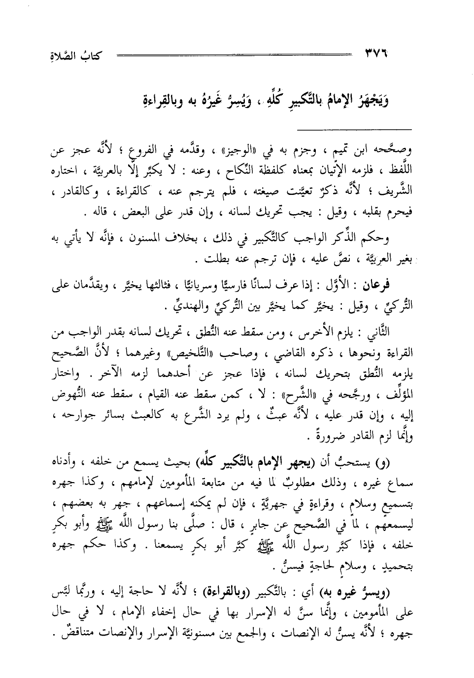 ويجهر الإمام بالتكبير كله ويسر غيره به وبالقراءة
