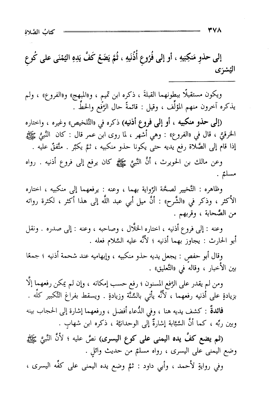 إلى حذو منكبيه أو إلى فروع أذنيه ثم يضع كف يده اليمنى على كوع اليسرى