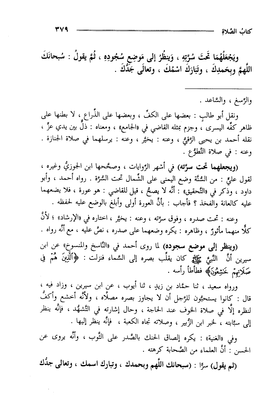 ويجعلهما تحت سرته وينظر إلى موضع سجوده ثم يقول سبحانك اللهم وبحمدك وتبارك اسمك وتعالى جدك