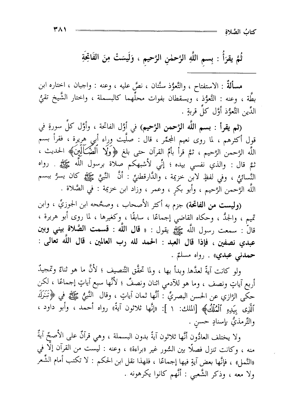 "وليست من الفاتحة" جزم به أكثر الأصحاب وصححه ابن الجوزي وابن تميم والجد وحكاه القاضي إجماعا سابقا وكغيرها لما روى أبو هريرة قال "سمعت رسول الله صلى الله عليه وسلم يقول: "قال الله قسمت الصلاة بيني وبين عبدي نصفين فإذا قال العبد {الْحَمْدُ لِلَّهِ رَبِّ الْعَالَمِينَ} قال الله تعالى حمدني عبدي " رواه مسلم