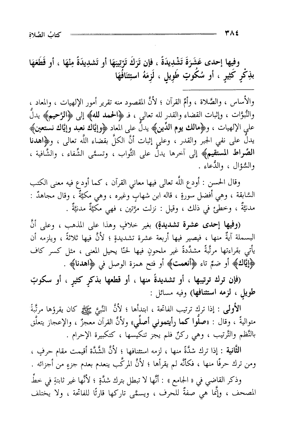 الأولى : إذا ترك ترتيب الفاتحة ابتدأها لأن النبي صلى الله عليه وسلم كان يقرؤها مرتبة متوالية وقال: "صلوا كما رأيتموني أصلي" ولأن القرآن معجز والإعجاز يتعلق بالنظم والترتيب وهي ركن فلم يجز تنكيسها كتكبيرة الإحرام.