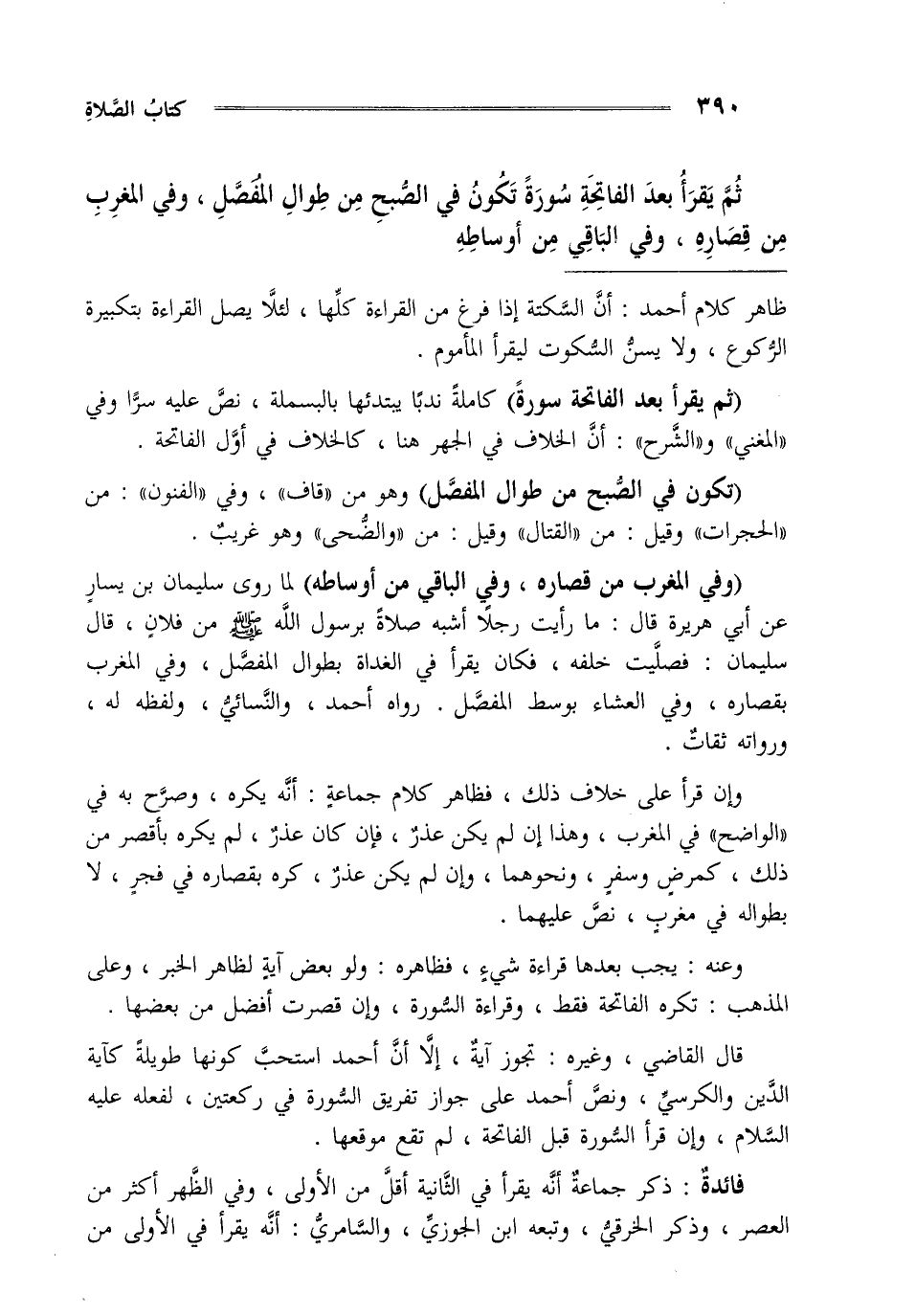 ثم يقرأ بعد الفاتحة سورة تكون في الصبح من طوال المفصل وفي المغرب من قصاره وفي الباقي من أوساطه