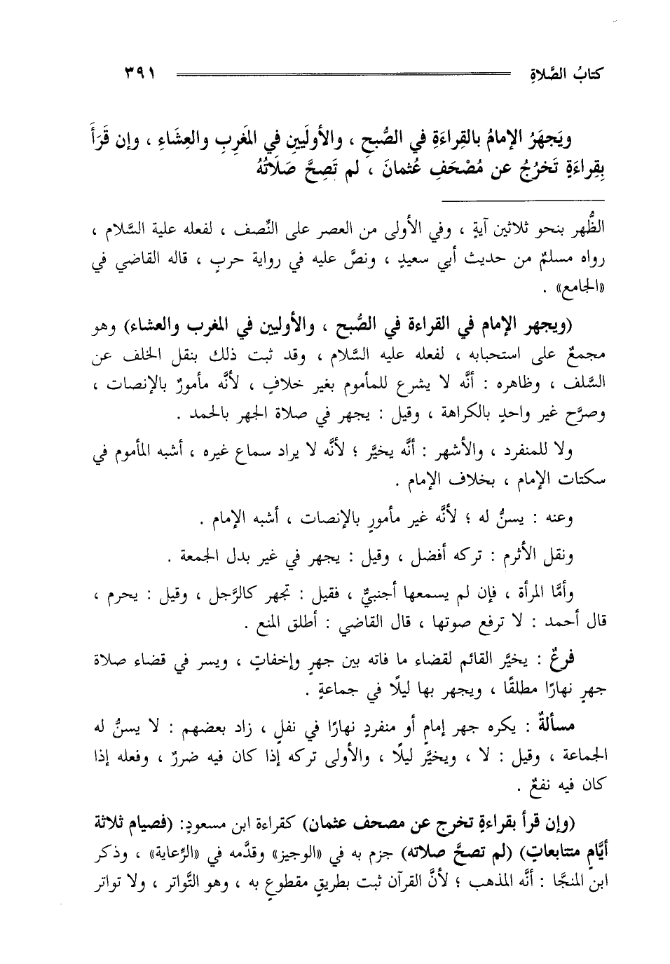 ويجهر الإمام بالقراءة في الصبح والأوليين في المغرب والعشاء وإن قرأ بقراءة تخرج عن مصحف عثمان لم تصح صلاته