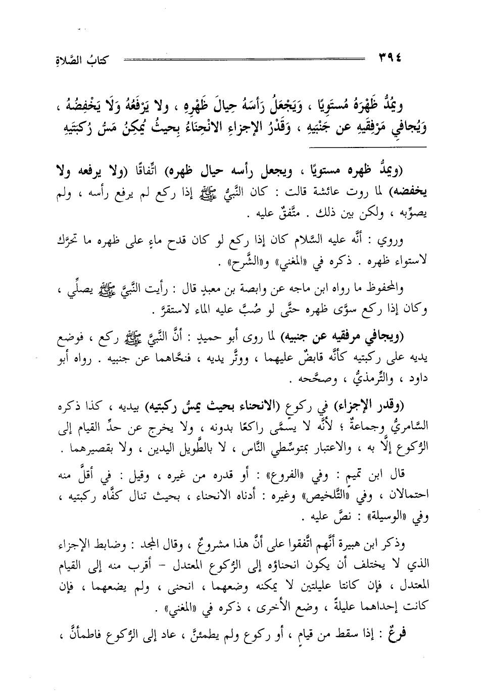 "ويمد ظهره مستويا ويجعل رأسه حيال ظهره" اتفاقا "ولا يرفعه ولا يخفضه" لما روت عائشة قالت "كان النبي صلى الله عليه وسلم إذا ركع لم يرفع رأسه ولم يصوبه ولكن بين ذلك" متفق عليه.