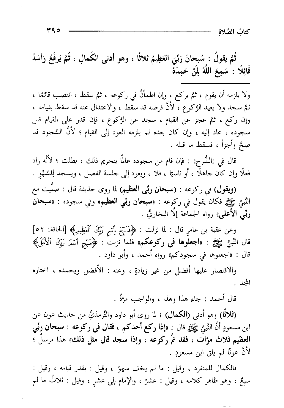 ثم يقول: سبحان ربي العظيم ثلاثا وهو أدنى الكمال ثم يرفع رأسه قائلا سمع الله لمن حمده