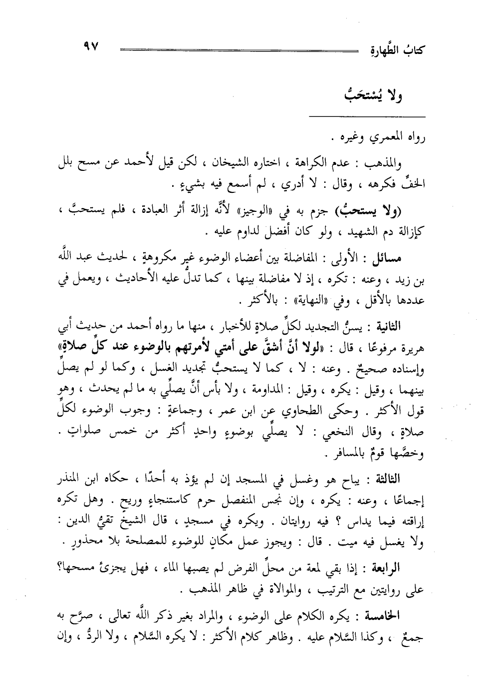 الثانية : يسن التجديد لكل صلاة للأخبار منها ما وراه أحمد من حديث أبي هريرة مرفوعا قال: " لولا أن أشق على أمتي لأمرتهم بالوضوء عند كل صلاة" وإسناده صحيح وعنه لا كما لا يستحب تجديد الغسل وكما لو لم يصل بينهما وقيل يكره وقيل المداومة ولا بأس أن يصلي به ما لم يحدث وهو قول الأكثر وحكى الطحاوي عن ابن عمر وجماعة وجوب الوضوء لكل صلاة وقال النخعي لا يصلي بوضوء واحد أكثر من خمس صلوات وخصها قوم بالمسافر