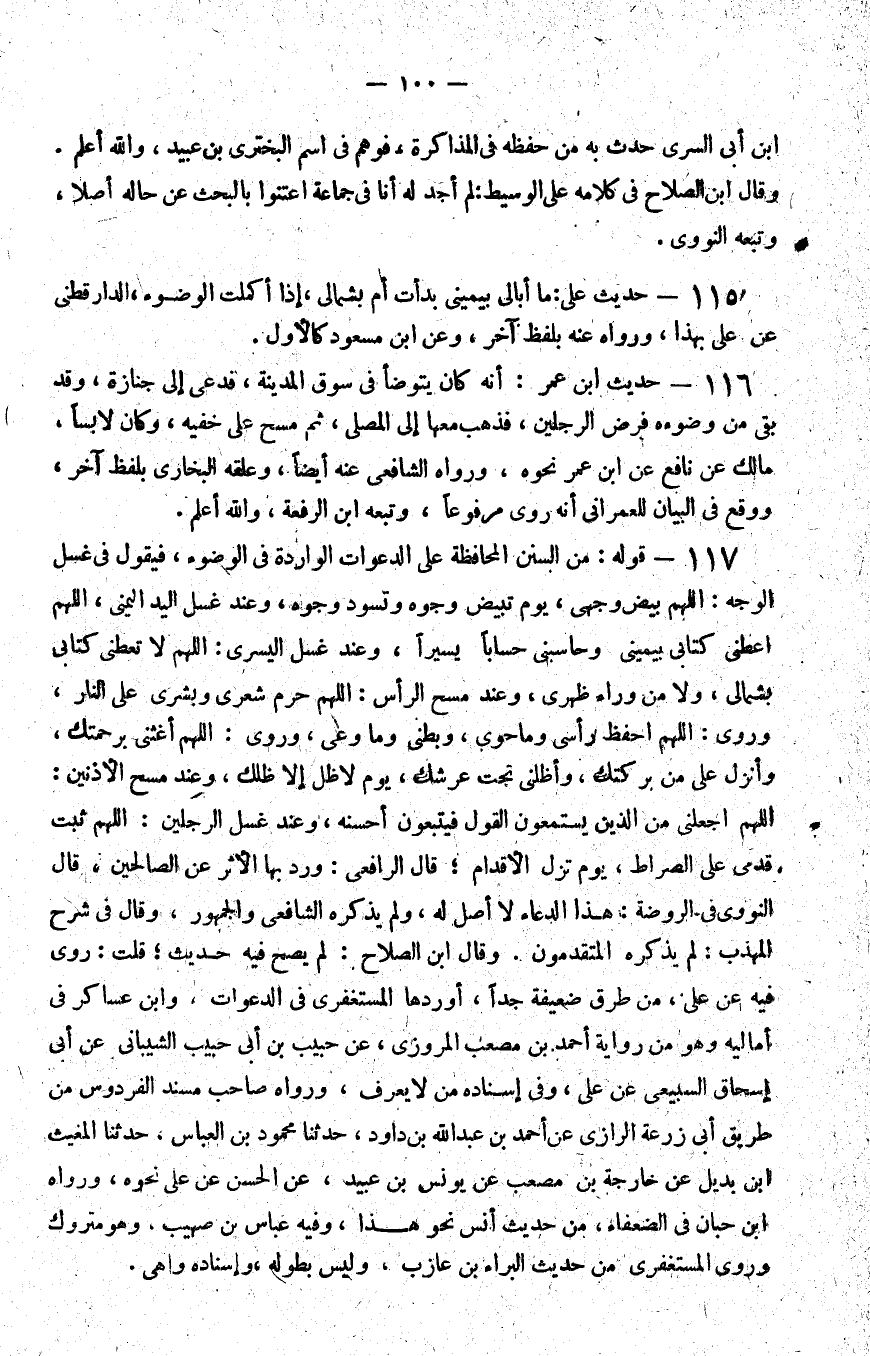 117 - قوله من السنن المحافظة على الدعوات الواردة في الوضوء فيقول في غسل الوجه اللهم بيض وجهي يوم تبيض وجوه وتسود وجوه وعند غسل اليد اليمنى اللهم اعطني كتابي بيميني وحاسبني حسابا يسيرا وعند غسل اليسرى اللهم لا تعطني كتابي بشمالي ولا من وراء ظهري وعند مسح الرأس اللهم حرم شعري وبشري على النار وروي اللهم احفظ رأسي وما حوى وبطني وما وعى وروي اللهم أغثني برحمتك وأنزل علي من بركتك وأظلني تحت عرشك يوم لا ظل إلا ظلك وعند مسح الأذنين اللهم اجعلني من الذين يستمعون القول فيتبعون أحسنه وعند غسل الرجلين اللهم ثبت قدمي على الصراط يوم تزل الأقدام قال الرافعي ورد بها الأثر عن الصالحين قال النووي في الروضة هذا الدعاء لا أصل له ولم يذكره الشافعي والجمهور وقال في شرح المذهب لم يذكره المتقدمون وقال بن الصلاح لم يصح فيه حديث قلت روى فيه عن علي من طرق ضعيفة جدا أوردها المستغفري في الدعوات وابن عساكر في أماليه وهو من رواية أحمد بن مصعب المروزي عن حبيب بن أبي حبيب الشيباني عن أبي إسحاق السبيعي عن علي وفي إسناده من لا يعرف ورواه صاحب مسند الفردوس من طريق أبي زرعة الرازي عن أحمد بن عبد الله بن داود حدثنا محمود بن العباس حدثنا المغيث بن بديل عن خارجة بن مصعب عن يونس بن عبيد عن الحسن عن علي نحوه ورواه بن حبان في الضعفاء من حديث أنس نحو هذا وفيه عباس بن صهيب وهو متروك وروى المستغفري من حديث البراء بن عازب وليس بطوله وإسناده واهي