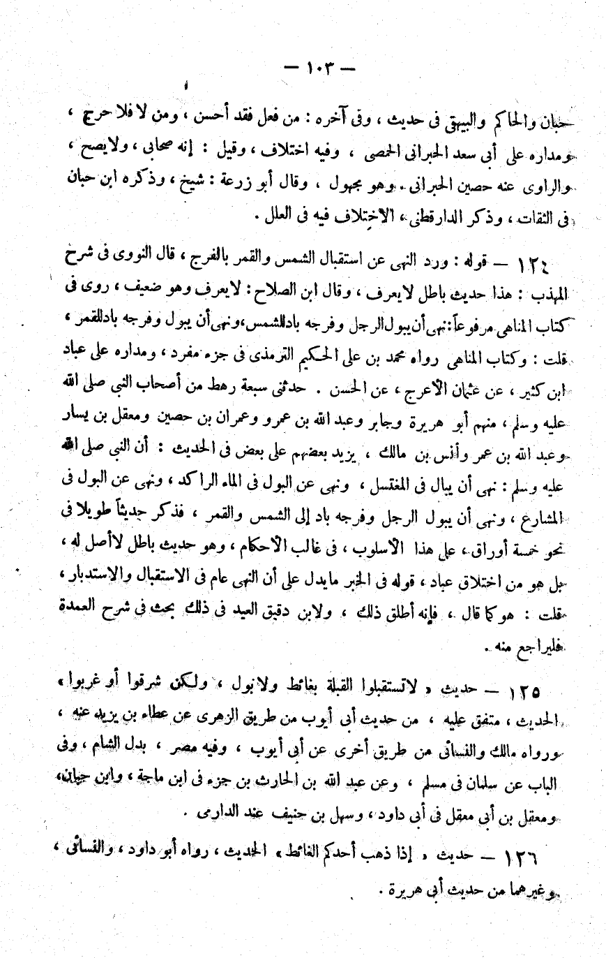 124 - قوله ورد النهي عن استقبال الشمس والقمر بالفرج قال النووي في شرح المهذب هذا حديث باطل لا يعرف وقال بن الصلاح لا يعرف وهو ضعيف روي في كتاب المناهي مرفوعا نهى أن يبول الرجل وفرجه باد للشمس ونهى أن يبول وفرجه باد للقمر قلت وكتاب المناهي رواه محمد بن علي الحكيم الترمذي في جزء مفرد ومداره على عباد بن كثير عن عثمان الأعرج عن الحسن حدثني سبعة رهط من أصحاب النبي صلى الله عليه و سلم منهم أبو هريرة وجابر وعبد الله بن عمرو وعمران بن حصين ومعقل بن يسار وعبد الله بن عمر وأنس بن مالك يزيد بعضهم على بعض في الحديث أن النبي صلى الله عليه و سلم نهى أن يبال في المغتسل ونهى عن البول في الماء الراكد ونهى عن البول في المشارع ونهى أن يبول الرجل وفرجه باد إلى الشمس والقمر فذكر حديثا طويلا في نحو خمسة أوراق على هذا الأسلوب في غالب الأحكام وهو حديث باطل لا أصل له جل هو من اختلاق عباد قوله في الخبر ما يدل على أن النهي عام في الاستقبال والاستدبار قلت هو كما قال فإنه أطلق ذلك ولابن دقيق العيد في ذلك بحث في شرح العمدة فليراجع منه