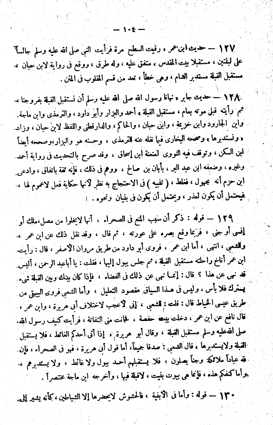 127 - حديث بن عمر رقيت السطح مرة فرأيت النبي صلى الله عليه و سلم جالسا على لبنتين مستقبلا بيت المقدس متفق عليه وله طرق ووقع في رواية لابن حبان مستقبل القبلة مستدبر الشام وهي خطأ تعد من قسم المقلوب في المتن