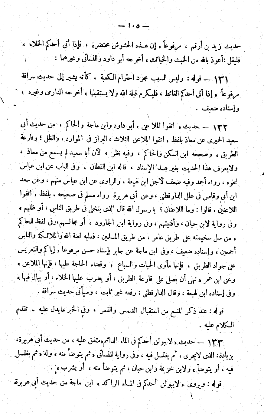 132 - حديث اتقوا الملاعن أبو داود وابن ماجة والحاكم من حديث أبي سعيد الحميري عن معاذ بلفظ اتقوا الملاعن الثلاث البزار في الموارد والظل وقارعة الطريق وصححه بن السكن والحاكم وفيه نظر لأن أبا سعيد لم يسمع من معاذ ولا يعرف هذا الحديث بغير هذا الإسناد قاله بن القطان وفي الباب عن بن عباس نحوه رواه أحمد وفيه ضعف لأجل بن لهيعة والراوي عن بن عباس منهم وعن سعد بن أبي وقاص في علل الدارقطني وعن أبي هريرة رواه مسلم في صحيحه بلفظ اتقوا اللاعنين قالوا وما اللاعنان يا رسول الله قال الذي يتخلى في طريق الناس أو ظلهم وفي رواية لابن حبان وأفنيتهم وفي رواية بن الجارود أو مجالسهم وفي لفظ للحاكم من سل سخيمته على طريق عامر من طريق المسلمين فعليه لعنة الله والملائكة والناس أجمعين وإسناده ضعيف وفي بن ماجة عن جابر بإسناد حسن مرفوعا إياكم والتعريس على جواد الطريق فإنها مأوى الحيات والسباع وقضاء الحاجة عليها فإنها الملاعن وعن بن عمر نهى أن يصلى على قارعة الطريق أو يضرب عليها الخلاء أو يبال فيها وفي إسناده بن لهيعة وقال الدارقطني رفعه غير ثابت وسيأتي حديث سراقة