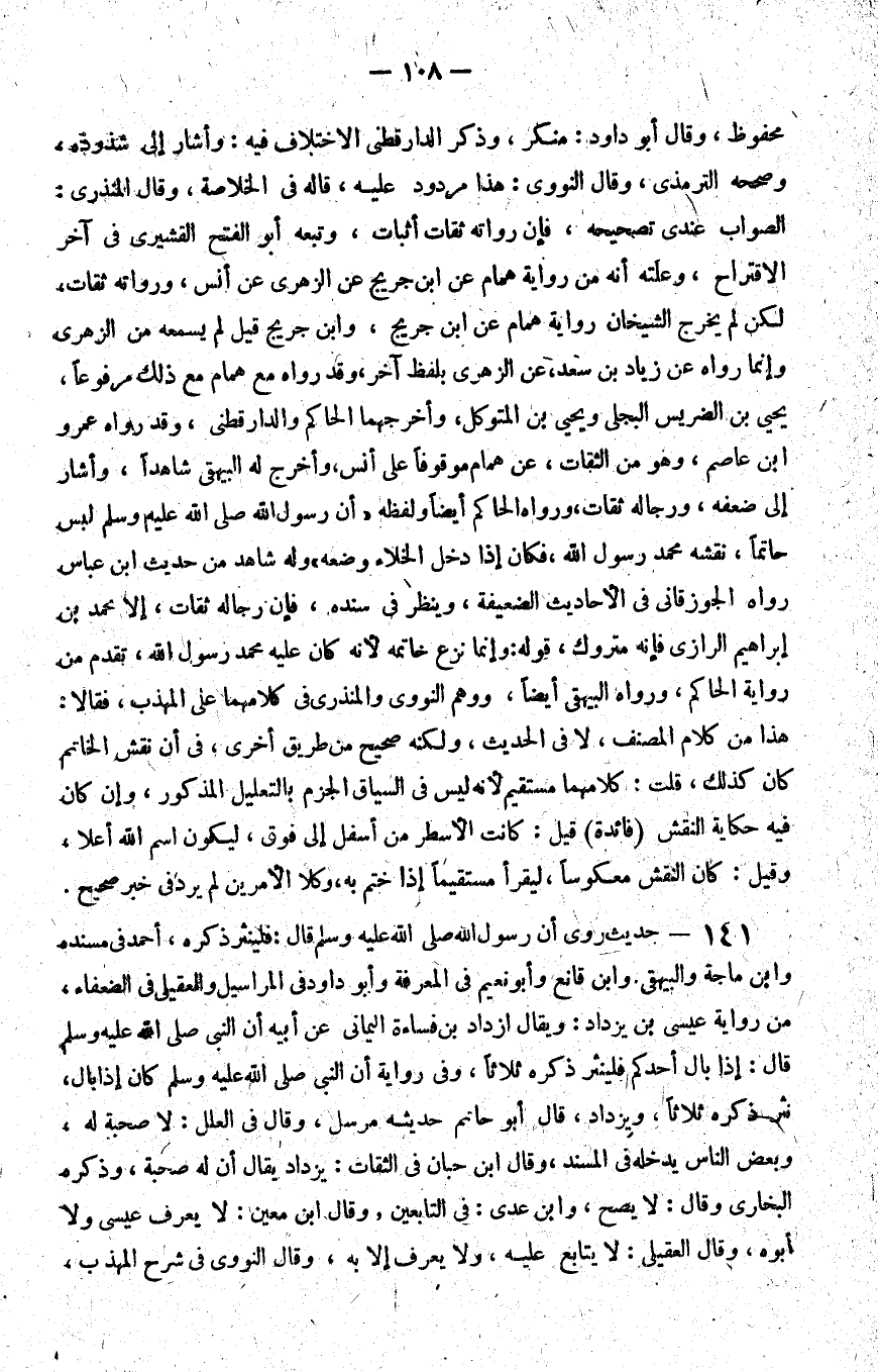 141 - حديث روي أن رسول الله صلى الله عليه و سلم قال فلينثر ذكره أحمد في مسنده وابن ماجة والبيهقي وابن قانع وأبو نعيم في المعرفة وأبو داود في المراسيل والعقيلي في الضعفاء من رواية عيسى بن يزداد ويقال ازداد بن فساءة اليماني عن أبيه أن النبي صلى الله عليه و سلم قال إذا بال أحدكم فلينثر ذكره ثلاثا وفي رواية أن النبي صلى الله عليه و سلم كان إذا بال نثر ذكره ثلاثا ويزداد قال أبو حاتم حديثه مرسل وقال في العلل لا صحبة له وبعض الناس يدخله في المسند وقال بن حبان في الثقات يزداد يقال أن له صحبة وذكره البخاري وقال لا يصح وابن عدي في التابعين وقال بن معين لا يعرف عيسى ولا أبوه وقال العقيلي لا يتابع عليه ولا يعرف إلا به وقال النووي في شرح المهذب