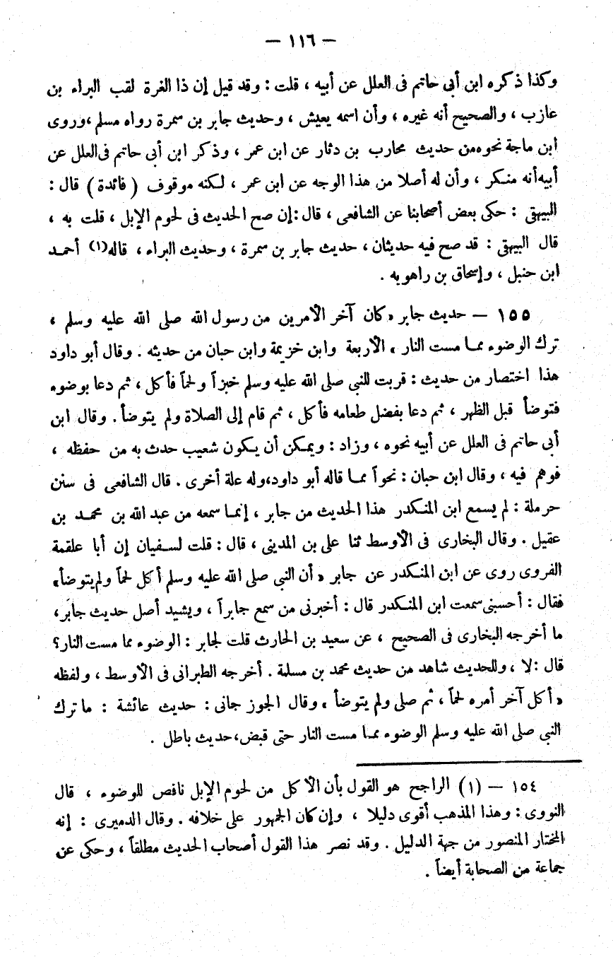 155 - حديث جابر كان آخر الأمرين من رسول الله صلى الله عليه و سلم ترك الوضوء مما مست النار الأربعة وابن خزيمة وابن حبان من حديثه وقال أبو داود هذا اختصار من حديث قربت للنبي صلى الله عليه و سلم خبزا ولحما فأكل ثم دعا بوضوء فتوضأ قبل الظهر ثم دعا بفضل طعامه فأكل ثم قام إلى الصلاة ولم يتوضأ وقال بن أبي حاتم في العلل عن أبيه نحوه وزاد ويمكن أن يكون شعيب حدث به من حفظه فوهم فيه وقال بن حبان نحوا مما قاله أبو داود وله علة أخرى قال الشافعي في سنن حرملة لم يسمع بن المنكدر هذا الحديث من جابر إنما سمعه من عبد الله بن محمد بن عقيل وقال البخاري في الأوسط ثنا علي بن المديني قال قلت لسفيان إن أبا علقمة الفروي روى عن بن المنكدر عن جابر أن النبي صلى الله عليه و سلم أكل لحما ولم يتوضأ فقال أحسبني سمعت بن المنكدر قال أخبرني من سمع جابرا ويشيد أصل حديث جابر ما أخرجه البخاري في الصحيح عن سعيد بن الحارث قلت لجابر الوضوء مما مست النار قال لا وللحديث شاهد من حديث محمد بن مسلمة أخرجه الطبراني في الأوسط ولفظه أكل آخر أمره لحما ثم صلى ولم يتوضأ وقال الجوزجاني حديث عائشة ما ترك النبي صلى الله عليه و سلم الوضوء مما مست النار حتى قبض حديث باطل