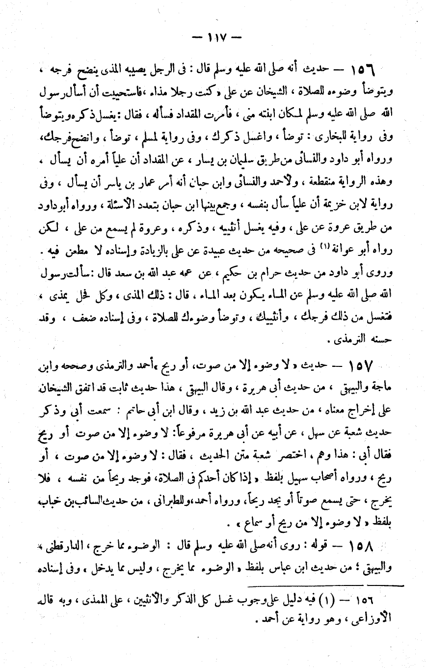 156 - حديث أنه صلى الله عليه و سلم قال في الرجل يصيبه المذي ينضح فرجه ويتوضأ وضوءه للصلاة الشيخان عن علي كنت رجلا مذاء فاستحييت أن أسأل رسول الله صلى الله عليه و سلم لمكان ابنته مني فأمرت المقداد فسأله فقال يغسل ذكره ويتوضأ وفي رواية للبخاري توضأ واغسل ذكرك وفي رواية لمسلم توضأ وانضح فرجك ورواه أبو داود والنسائي من طريق سليمان بن يسار عن المقداد أن عليا أمره أن يسأل وهذه الرواية منقطعة ولأحمد والنسائي وابن حبان أنه أمر عمار بن ياسر أن يسأل وفي رواية لابن خزيمة أن عليا سأل بنفسه وجمع بينها بن حبان بتعدد الأسئلة ورواه أبو داود من طريق عروة عن علي وفيه يغسل أنثييه وذكره وعروة لم يسمع من علي لكن رواه أبو عوانة 1 في صحيحه من حديث عبيدة عن علي بالزيادة وإسناده لا مطعن فيه وروى أبو داود من حديث حرام بن حكيم عن عمه عبد الله بن سعد قال سألت رسول الله صلى الله عليه و سلم عن الماء يكون بعد الماء قال ذلك المذي وكل فحل يمذي فتغسل من ذلك فرجك وأنثييك وتوضأ وضوءك للصلاة وفي إسناده ضعف وقد حسنه الترمذي
