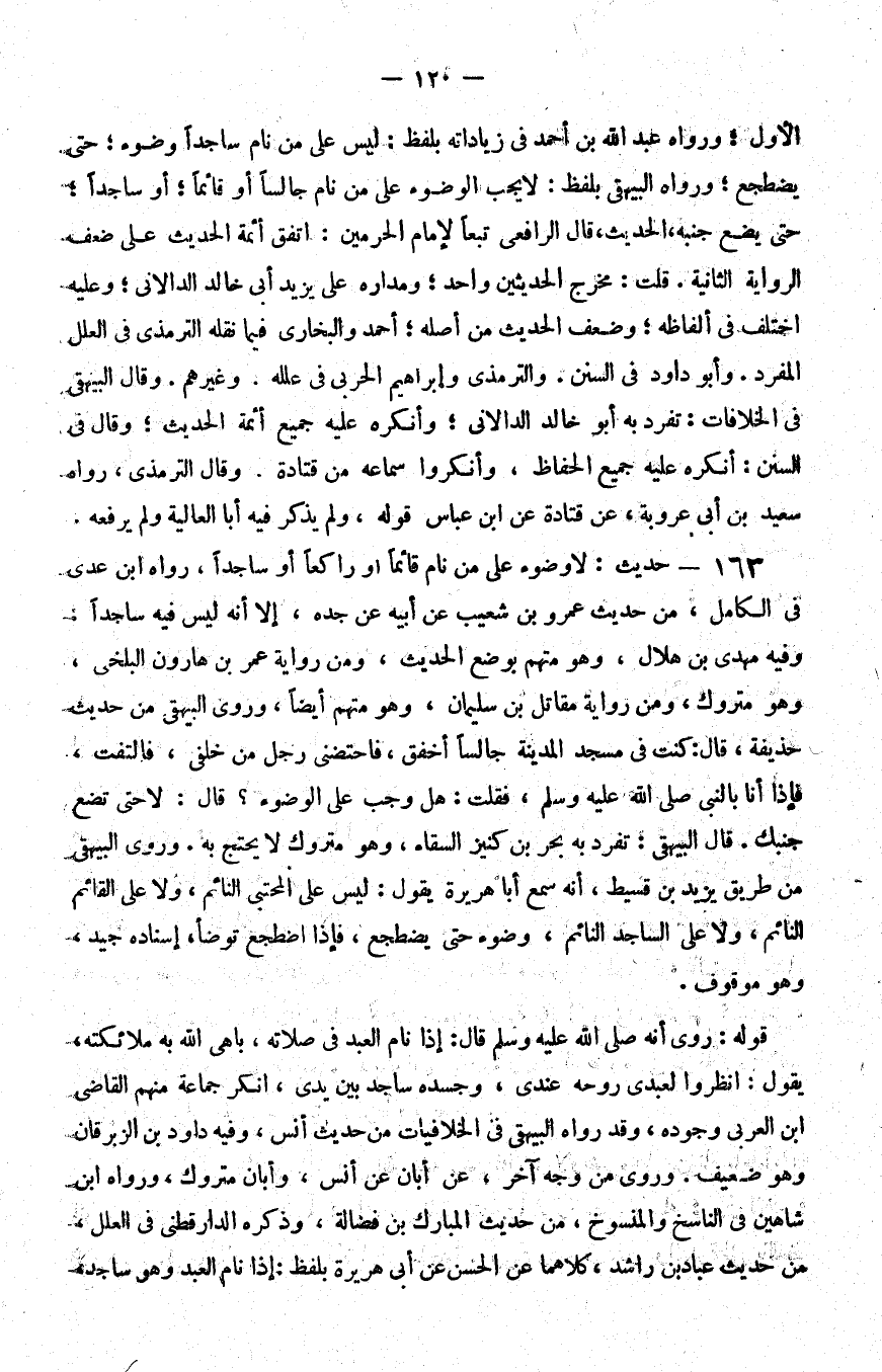 163 - حديث لا وضوء على من نام قائما أو راكعا أو ساجدا رواه بن عدي في الكامل من حديث عمرو بن شعيب عن أبيه عن جده إلا أنه ليس فيه ساجدا وفيه مهدي بن هلال وهو متهم بوضع الحديث ومن رواية عمر بن هارون البلخي وهو متروك ومن رواية مقاتل بن سليمان وهو متهم أيضا وروى البيهقي من حديث حذيفة قال كنت في مسجد المدينة جالسا أخفق فاحتضني رجل من خلفي فالتفت فإذا أنا بالنبي صلى الله عليه و سلم فقلت هل وجب علي الوضوء قال لا حتى تضع جنبك قال البيهقي تفرد به بحر بن كنيز السقاء وهو متروك لا يحتج به وروى البيهقي من طريق يزيد بن قسيط أنه سمع أبا هريرة يقول ليس على المحتبي النائم ولا على القائم النائم ولا على الساجد النائم وضوء حتى يضطجع فإذا اضطجع توضأ إسناده جيد وهو موقوف
