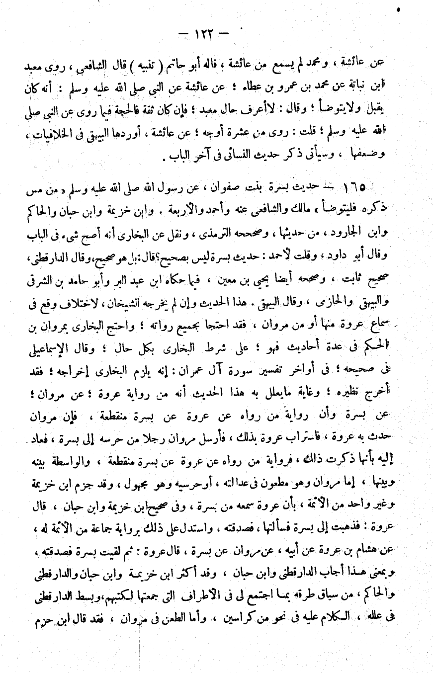 165 - حديث بسرة بنت صفوان عن رسول الله صلى الله عليه و سلم من مس ذكره فليتوضأ مالك والشافعي عنه وأحمد والأربعة وابن خزيمة وابن حبان والحاكم وابن الجارود من حديثها وصححه الترمذي ونقل عن البخاري أنه أصح شيء في الباب وقال أبو داود وقلت لأحمد حديث بسرة ليس بصحيح قال بل هو صحيح وقال الدارقطني صحيح ثابت وصححه أيضا يحيى بن معين فيما حكاه بن عبد البر وأبو حامد بن الشرقي والبيهقي والحازمي وقال البيهقي هذا الحديث وإن لم يخرجه الشيخان لاختلاف وقع في سماع عروة منها أو من مروان فقد احتجا بجميع رواته واحتج البخاري بمروان بن الحكم في عدة أحاديث فهو على شرط البخاري بكل حال وقال الإسماعيلي في صحيحه في أواخر تفسير سورة آل عمران إنه يلزم البخاري إخراجه فقد أخرج نظيره وغاية ما يعلل به هذا الحديث أنه من رواية عروة عن مروان عن بسرة وأن رواية من رواه عن عروة عن بسرة منقطعة فإن مروان حدث به عروة فاستراب عروة بذلك فأرسل مروان رجلا من حرسه إلى بسرة فعاد إليه بأنها ذكرت ذلك فرواية من رواه عن عروة عن بسرة منقطعة والواسطة بينه وبينها إما مروان وهو مطعون في عدالته أو حرسيه وهو مجهول وقد جزم بن خزيمة وغير واحد من الأئمة بأن عروة سمعه من بسرة وفي صحيح بن خزيمة وابن حبان قال عروة فذهبت إلى بسرة فسألتها فصدقته واستدل على ذلك برواية جماعة من الأئمة له عن هشام بن عروة عن أبيه عن مروان عن بسرة قال عروة ثم لقيت بسرة فصدقته وبمعنى هذا أجاب الدارقطني وابن حبان وقد أكثر بن خزيمة وابن حبان والدارقطني والحاكم من سياق طرقه بما اجتمع لي في الأطراف التي جمعتها لكتبهم وبسط الدارقطني في علله الكلام عليه في نحو من كراسين وأما الطعن في مروان فقد قال بن حزم