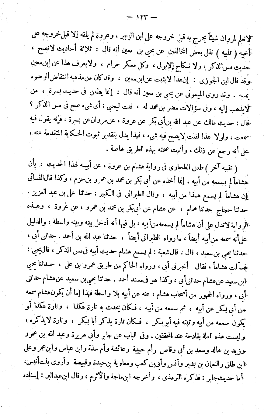 تنبيه آخر طعن الطحاوي في رواية هشام بن عروة عن أبيه لهذا الحديث بأن هشاما لم يسمعه من أبيه إنما أخذه عن أبي بكر بن محمد بن عمرو بن حزم وكذا قال النسائي إن هشاما لم يمسع هذا من أبيه وقال الطبراني في الكبير حدثنا علي بن عبد العزيز حدثنا حجاج حدثنا همام عن هشام عن أبي بكر بن محمد بن عمرو عن عروة وهذه الرواية لا تدل على أن هشاما لم يسمعه من أبيه بل فيها أنه أدخل بينه وبينه واسطة والدليل على أنه سمعه من أبيه أيضا ما رواه الطبراني أيضا حدثنا عبد الله بن أحمد حدثني أبي حدثنا يحيى بن سعيد قال قال شعبة لم يسمع هشام حديث أبيه في مس الذكر قال يحيى فسألت هشاما فقال أخبرني أبي ورواه الحاكم من طريق عمرو بن علي حدثنا يحيى بن سعيد عن هشام حدثني أبي وكذا هو في مسند أحمد حدثنا يحيى بن سعيد عن هشام حدثني أبي ورواه الجمهور من أصحاب هشام عنه عن أبيه بلا واسطة فهذا إما أن يكون هشام سمعه من أبي بكر عن أبيه ثم سمعه من أبيه فكان يحدث به تارة هكذا وتارة هكذا أو يكون سمعه من أبيه وثبته فيه أبو بكر فكان تارة يذكر أبا بكر وتارة لا يذكره وليست هذه العلة بقادحة عند المحققين وفي الباب عن جابر وأبي هريرة وعبد الله بن عمرو وزيد بن خالد وسعد بن أبي وقاص وأم حبيبة وعائشة وأم سلمة وابن عباس وابن عمر وعلي بن طلق والنعمان بن بشير وأنس وأبي بن كعب ومعاوية بن حيدة وقبيصة وأروى بنت أنيس أما حديث جابر فذكره الترمذي وأخرجه بن ماجة والأثرم وقال بن عبد البر إسناده