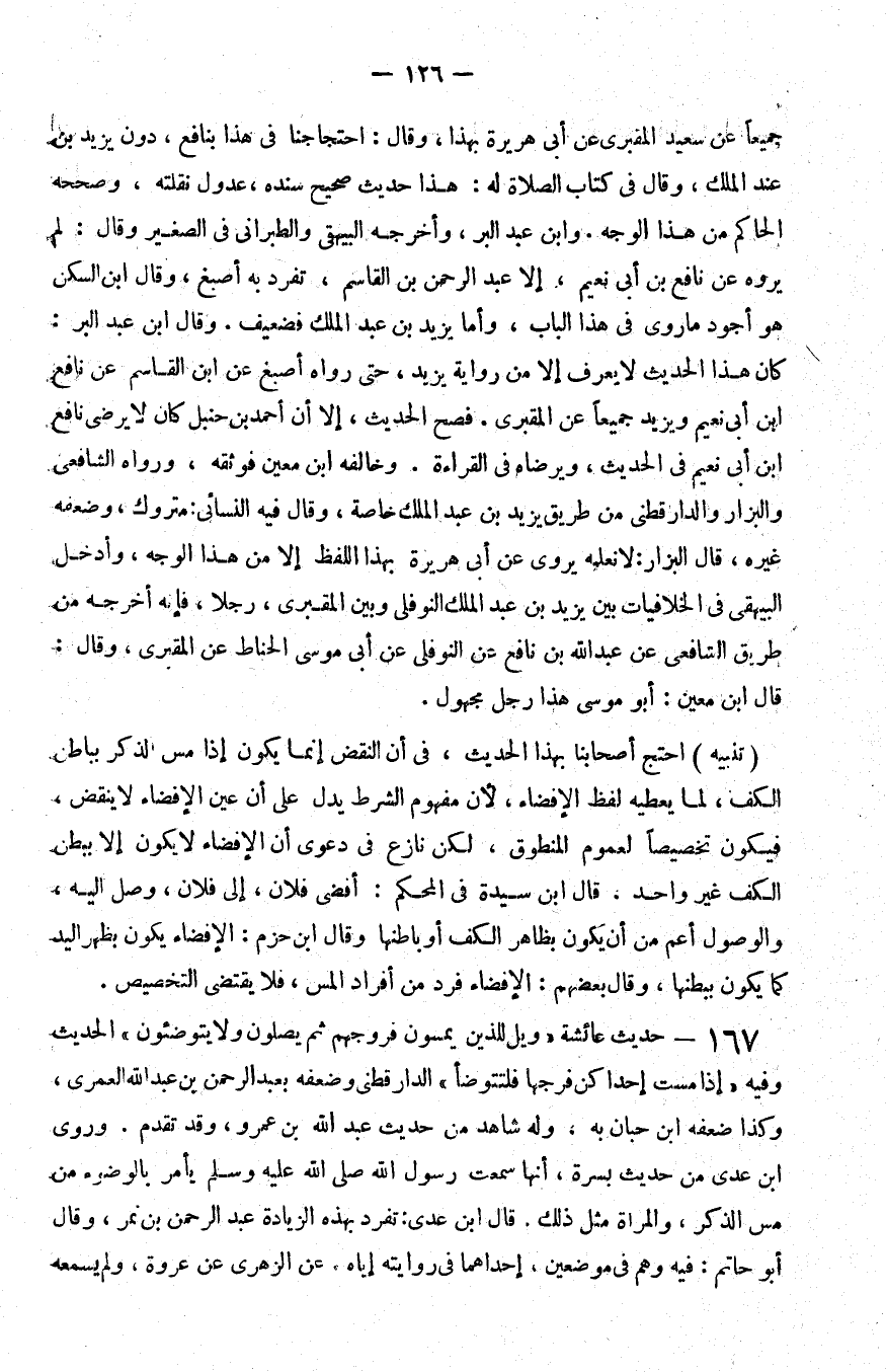 167 - حديث عائشة ويل للذين يمسون فروجهم ثم يصلون ولا يتوضئون الحديث وفيه إذا مست إحداكن فرجها فلتتوضأ الدارقطني وضعفه بعبد الرحمن بن عبد الله العمري وكذا ضعفه بن حبان به وله شاهد من حديث عبد الله بن عمرو وقد تقدم وروى بن عدي من حديث بسرة أنها سمعت رسول الله صلى الله عليه و سلم يأمر بالوضوء من مس الذكر والمرأة مثل ذلك قال بن عدي تفرد بهذه الزيادة عبد الرحمن بن نمر وقال أبو حاتم فيه وهم في موضعين إحداهما في روايته إياه عن الزهري عن عروة ولم يسمعه