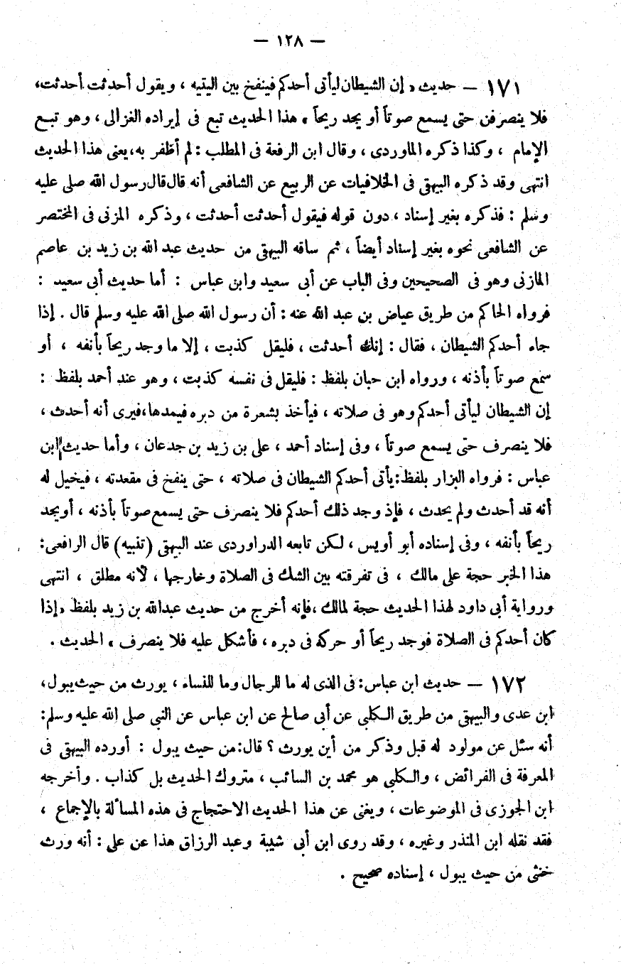 171 - حديث إن الشيطان ليأتي أحدكم فينفخ بين اليتيه ويقول أحدثت أحدثت فلا ينصرفن حتى يسمع صوتا أو يجد ريحا هذا الحديث تبع في إيراده الغزالي وهو تبع الإمام وكذا ذكره الماوردي وقال بن الرفعة في المطلب لم أظفر به يعني هذا الحديث انتهى وقد ذكره البيهقي في الخلافيات عن الربيع عن الشافعي أنه قال قال رسول الله صلى الله عليه و سلم فذكره بغير إسناد دون قوله فيقول أحدثت أحدثت وذكره المزني في المختصر عن الشافعي نحوه بغير إسناد أيضا ثم ساقه البيهقي من حديث عبد الله بن زيد بن عاصم المازني وهو في الصحيحين وفي الباب عن أبي سعيد وابن عباس أما حديث أبي سعيد فرواه الحاكم من طريق عياض بن عبد الله عنه أن رسول الله صلى الله عليه و سلم قال إذا جاء أحدكم الشيطان فقال إنك أحدثت فليقل كذبت إلا ما وجد ريحا بأنفه أو سمع صوتا بأذنه ورواه بن حبان بلفظ فليقل في نفسه كذبت وهو عند أحمد بلفظ إن الشيطان ليأتي أحدكم وهو في صلاته فيأخذ بشعرة من دبره فيمدها فيرى أنه أحدث فلا ينصرف حتى يسمع صوتا وفي إسناد أحمد علي بن زيد بن جدعان وأما حديث بن عباس فرواه البزار بلفظ يأتي أحدكم الشيطان في صلاته حتى ينفخ في مقعدته فيخيل له أنه قد أحدث ولم يحدث فإذا وجد ذلك أحدكم فلا ينصرف حتى يسمع صوتا بأذنه أو يجد ريحا بأنفه وفي إسناده أبو أويس لكن تابعه الدراوردي عند البيهقي