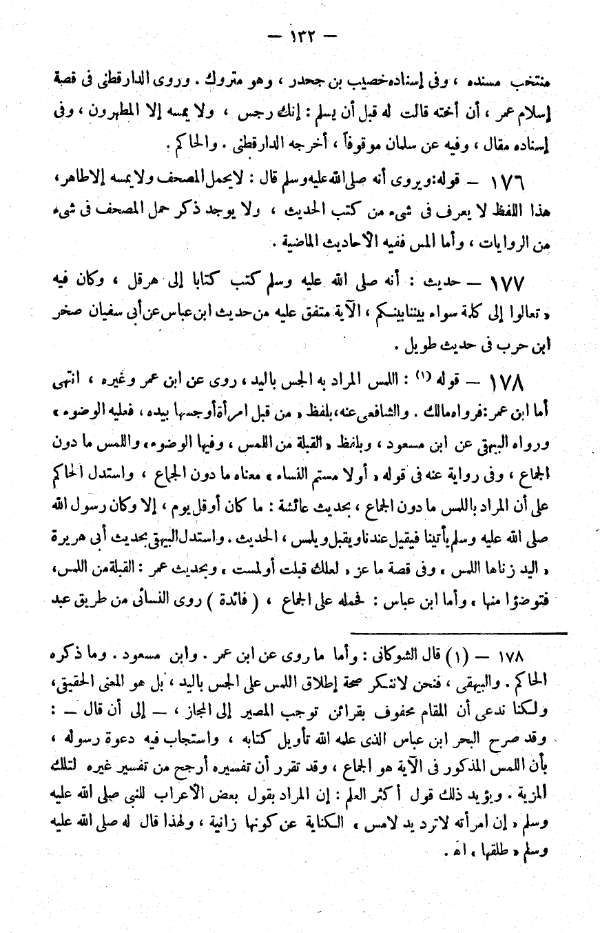 178 - قوله1 اللمس المراد به الجس باليد روى عن بن عمر وغيره انتهى أما بن عمر فرواه مالك والشافعي عنه بلفظ من قبل امرأة أو جسها بيده فعليه الوضوء ورواه البيهقي عن بن مسعود وبلفظ القبلة من اللمس وفيها الوضوء واللمس ما دون الجماع وفي رواية عنه في قوله أو لامستم النساء معناه ما دون الجماع واستدل الحاكم على أن المراد باللمس ما دون الجماع بحديث عائشة ما كان أو قل يوم إلا وكان رسول الله صلى الله عليه و سلم يأتينا فيقيل عندنا ويقبل ويلمس الحديث واستدل البيهقي بحديث أبي هريرة اليد زناها اللمس وفي قصة ماعز لعلك قبلت أو لمست وبحديث عمر القبلة من اللمس فتوضؤوا منها وأما بن عباس فحمله على الجماع