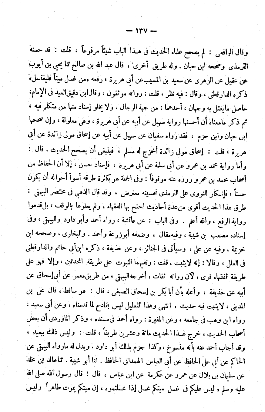 وقال الرافعي لم يصحح علماء الحديث في هذا الباب شيئا مرفوعا قلت قد حسنه الترمذي وصححه بن حبان وله طريق أخرى قال عبد الله بن صالح ثنا يحيى بن أيوب عن عقيل عن الزهري عن سعيد بن المسيب عن أبي هريرة رفعه من غسل ميتا فليغتسل ذكره الدارقطني وقال فيه نظر قلت رواته موثقون وقال بن دقيق العيد في الإمام حاصل ما يعتل به وجهان أحدهما من جهة الرجال ولا يخلو إسناد منها من متكلم فيه ثم ذكر ما معناه أن أحسنها روياة سهيل عن أبيه عن أبي هريرة وهي معلولة وإن صححها بن حبان وابن حزم فقد رواه سفيان عن سهيل عن أبيه عن إسحاق مولى زائدة عن أبي هريرة قلت إسحاق مولى زائدة أخرج له مسلم فينبغي أن يصحح الحديث قال وأما رواية محمد بن عمرو عن أبي سلمة عن أبي هريرة فإسناد حسن إلا أن الحفاظ من أصحاب محمد بن عمرو ورووه عنه موقوفا وفي الجملة هو بكثرة طرقه أسوأ أحواله أن يكون حسنا فإنكار النووي على الترمذي تحسينه معترض وقد قال الذهبي في مختصر البيهقي طرق هذا الحديث أقوى من عدة أحاديث احتج بها الفقهاء ولم يعلوها بالوقف بل قدموا رواية الرفع والله أعلم وفي الباب عن عائشة رواه أحمد وأبو داود والبيهقي وفي إسناده مصعب بن شيبة وفيه مقال وضعفه أبو زرعة وأحمد والبخاري وصححه بن خزيمة وفيه عن علي وسيأتي في الجنائز وعن حذيفة ذكره بن أبي حاتم والدارقطني في العلل وقالا إنه لا يثبت قلت ونفيهما الثبوت على طريقة المحدثين وإلا فهو على طريقة الفقهاء قوي لآن رواته ثقات أخرجه البيهقي من طريق معمر عن أبي إسحاق عن أبيه عن حذيفة وأعله بأن أبا بكر بن إسحاق الصبغي قال هو ساقط قال علي بن المديني لا يثبت فيه حديث انتهى وهذا التعليل ليس بقادح لما قدمناه وعن أبي سعيد رواه بن وهب في جامعه وعن المغيرة رواه أحمد في مسنده وذكر الماوردي أن بعض أصحاب الحديث خرج لهذا الحديث مائة وعشرين طريقا قلت وليس ذلك ببعيد وقد أجاب أحمد عنه بأنه منسوخ وكذا جزم بذلك أبو داود ويدل له ما رواه البيهقي عن الحاكم عن أبي على الحافظ عن أبي العباس الهمداني الحافظ ثنا أبو شيبة ثنا خالد بن مخلد عن سليمان بن بلال عن عمرو عن عكرمة عن بن عباس قال قال رسول الله صلى الله عليه و سلم ليس عليكم في غسل ميتكم غسل إذا غسلتموه إن ميتكم يموت طاهرا وليس