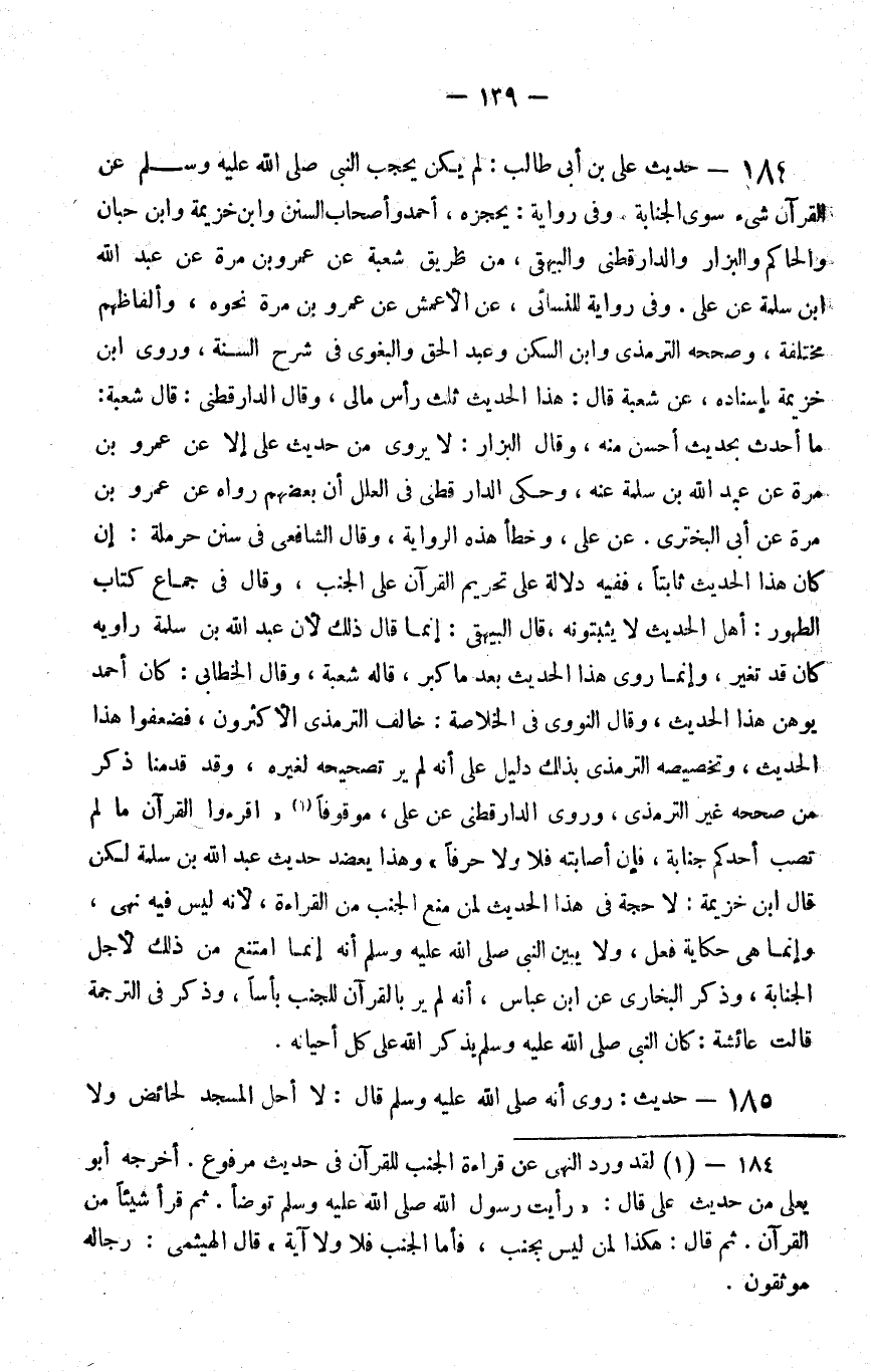 184 - حديث علي بن أبي طالب لم يكن يحجب النبي صلى الله عليه و سلم عن القرآن شيء سوى الجنابة وفي رواية يحجزه أحمد وأصحاب السنن وابن خزيمة وابن حبان والحاكم والبزار والدارقطني والبيهقي من طريق شعبة عن عمرو بن مرة عن عبد الله بن سلمة عن علي وفي رواية للنسائي عن الأعمش عن عمرو بن مرة نحوه وألفاظهم مختلفة وصححه الترمذي وابن السكن وعبد الحق والبغوي في شرح السنة وروى بن خزيمة بإسناده عن شعبة قال هذا الحديث ثلث رأس مالي وقال الدارقطني قال شعبة ما أحدث بحديث أحسن منه وقال البزار لا يروى من حديث علي إلا عن عمرو بن مرة عن عبد الله بن سلمة عنه وحكى الدارقطني في العلل أن بعضهم رواه عن عمرو بن مرة عن أبي البختري عن علي وخطأ هذه الرواية وقال الشافعي في سنن حرملة إن كان هذا الحديث ثابتا ففيه دلالة على تحريم القرآن على الجنب وقال في جماع كتاب الطهور أهل الحديث لا يثبتونه قال البيهقي إنما قال ذلك لأن عبد الله بن سلمة راويه كان قد تغير وإنما روى هذا الحديث بعد ما كبر قاله شعبة وقا ل الخطابي كان أحمد يوهن هذا الحديث وقال النووي في الخلاصة خالف الترمذي الأكثرون فضعفوا هذا الحديث وتخصيصه الترمذي بذلك دليل على أنه لم ير تصحيحه لغيره وقد قدمنا ذكر من صححه غير الترمذي وروى الدارقطني عن علي موقوفا1 اقرءوا القرآن ما لم تصب أحدكم جنابة فإن أصابته فلا ولا حرفا وهذا يعضد حديث عبد الله بن سلمة لكن قال بن خزيمة لا حجة في هذا الحديث لمن منع الجنب من القراءة لأنه ليس فيه نهي وإنما هي حكاية فعل ولا يبين النبي صلى الله عليه و سلم أنه إنما امتنع من ذلك لأجل الجنابة وذكر البخاري عن بن عباس أنه لم ير بالقرآن للجنب بأسا وذكر في الترجمة قالت عائشة كان النبي صلى الله عليه و سلم يذكر الله على كل أحيانه