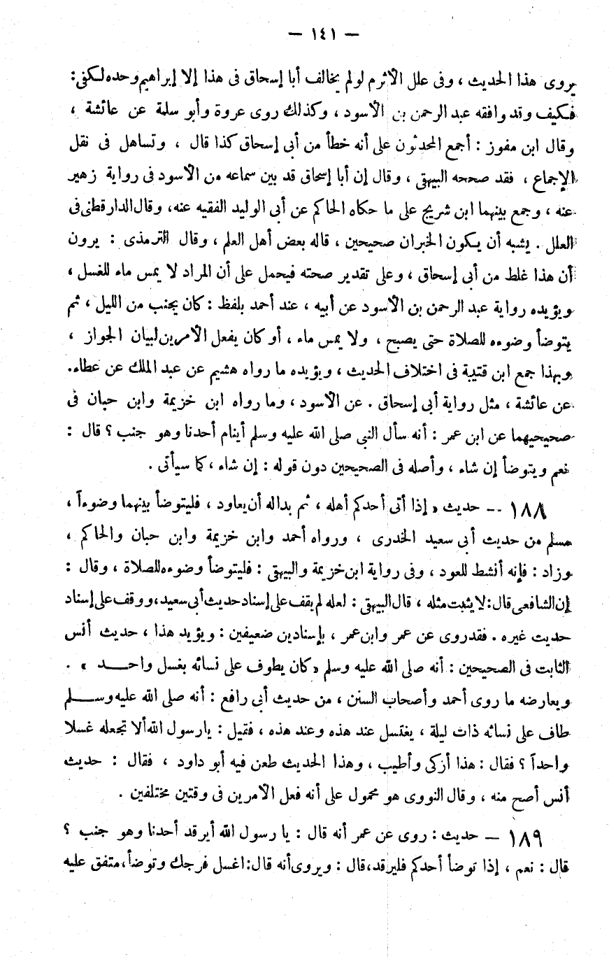 189 - حديث روي عن عمر أنه قال يا رسول الله أيرقد أحدنا وهو جنب قال نعم إذا توضأ أحدكم فليرقد قال ويروى أنه قال اغسل فرجك وتوضأ متفق عليه