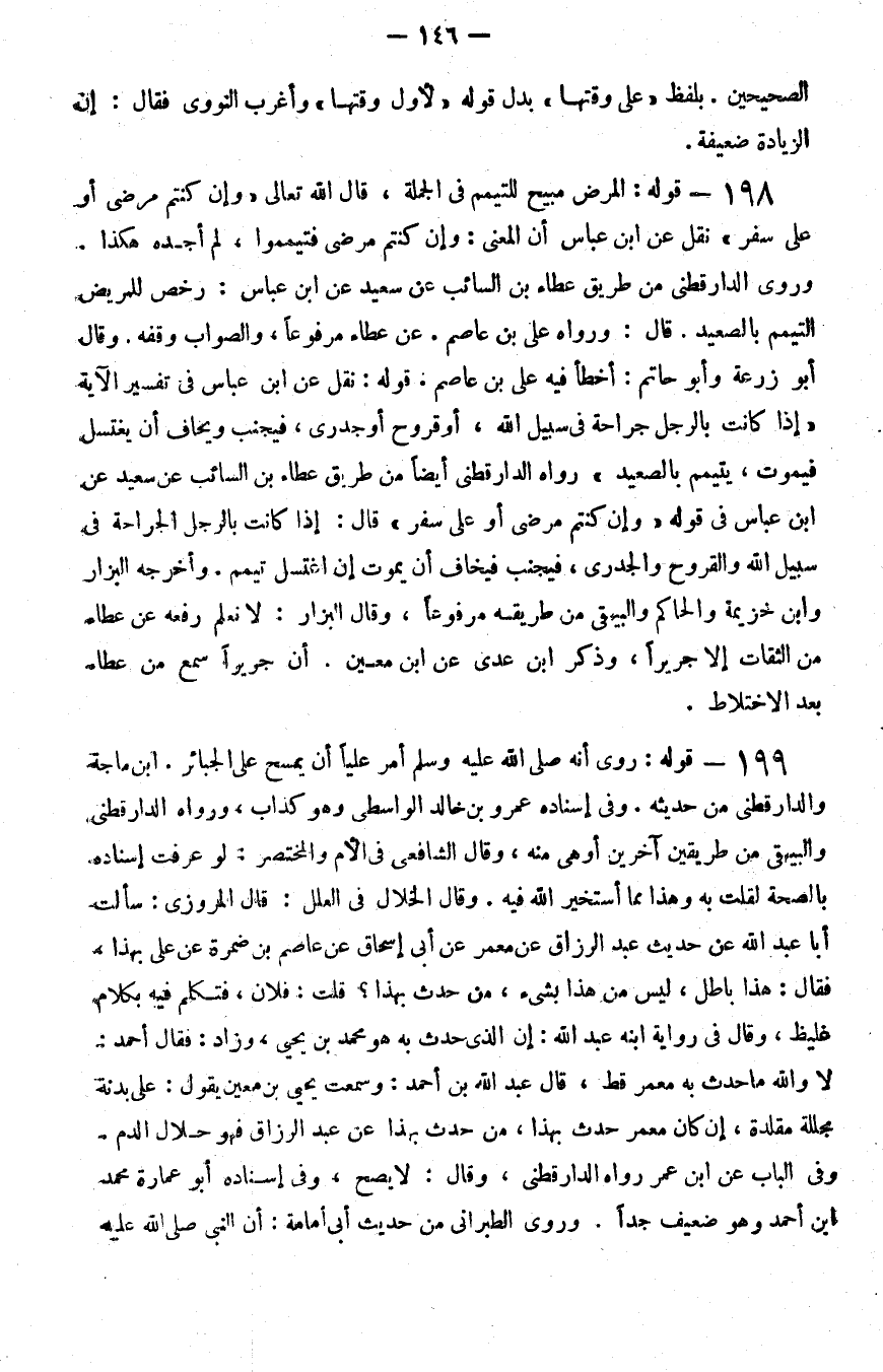 199 - قوله روي أنه صلى الله عليه و سلم أمر عليا أن يمسح على الجبائر بن ماجة والدارقطني من حديثه وفي إسناده عمرو بن خالد الواسطي وهو كذاب ورواه الدارقطني والبيهقي من طريقين آخرين أوهى منه وقال الشافعي في الأم والمختصر لو عرفت إسناده بالصحة لقلت به وهذا مما أستخير الله فيه وقال الخلال في العلل قال المروزي سألت أبا عبد الله عن حديث عبد الرزاق عن معمر عن أبي إسحاق عن عاصم بن ضمرة عن علي بهذا فقال هذا باطل ليس من هذا بشيء من حدث بهذا قلت فلان فتكلم فيه بكلام غليظ وقال في رواية ابنه عبد الله إن الذي حدث به هو محمد بن يحيى وزاد فقال أحمد لا والله ما حدث به معمر قط قال عبد الله بن أحمد وسمعت يحيى بن معين يقول على بدنة مجللة مقلدة إن كان معمر حدث بهذا من حدث بهذا عن عبد الرزاق فهو حلال الدم وفي الباب عن بن عمر رواه الدارقطني وقال لا يصح وفي إسناده أبو عمارة محمد بن أحمد وهو ضعيف جدا وروى الطبراني من حديث أبي أمامة أن النبي