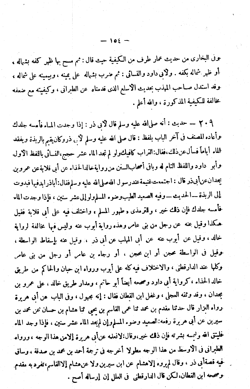 209 - حديث أنه صلى الله عليه و سلم قال لأبي ذر إذا وجدت الماء فأمسه جلدك وأعاده المصنف في آخر الباب بلفظ قال صلى الله عليه و سلم لأبي ذر وكان يقيم بالربذة ويفقد الماء أياما فسأل عن ذلك فقال التراب كافيك ولو لم تجد الماء عشر حجج النسائي باللفظ الأول وأبو داود واللفظ التام له وباقي أصحاب السنن من رواية خالد الحذاء عن أبي قلابة عن عمرو بن بجدان عن أبي ذر قال اجتمعت غنيمة عند رسول الله صلى الله عليه و سلم فقال أبا ذر ابد فيها فبدوت إلى الربذة الحديث وفيه الصعيد الطيب وضوء المسلم ولو إلى عشر سنين فإذا وجدت الماء فأمسه جلدك فإن ذلك خير وللترمذي طهور المسلم واختلف فيه على أبي قلابة فقيل هكذا وقيل عنه عن رجل من بني عامر وهذه رواية أيوب عنه وليس فيها مخالفة لرواية خالد وقيل عن أيوب عنه عن أبي المهلب عن أبي ذر وقيل عنه بإسقاط الواسطة وقيل في الواسطة محجن أو بن محجن أو رجاء بن عامر أو رجل من بني عامر وكلها عند الدارقطني والاختلاف فيه كله على أيوب ورواه بن حبان والحاكم من طريق خالد الحذاء كرواية أبي داود وصححه أيضا أبو حاتم ومدار طريق خالد على عمرو بن بجدان وقد وثقه العجلي وغفل بن القطان فقال إنه مجهول وفي الباب عن أبي هريرة رواه البزار قال حدثنا مقدم بن محمد ثنا عمي القاسم بن يحيى ثنا هشام بن حسان عن محمد بن سيرين عن أبي هريرة رفعه الصعيد وضوء المسلم وإن لم يجد الماء عشر سنين فإذا وجد الماء فليتق الله وليمسه بشرته فإن ذلك خير وقال لا نعلمه عن أبي هريرة إلا من هذا الوجه ورواه الطبراني في الأوسط من هذا الوجه مطولا أخرجه في ترجمة أحمد بن محمد بن صدقة وساق فيه قصة أبي ذر وقال لم يروه إلا هشام عن بن سيرين ولا عن هشام إلا القاسم تفرد به مقدم وصححه بن القطان لكن قال الدارقطني في العلل إن إرساله أصح