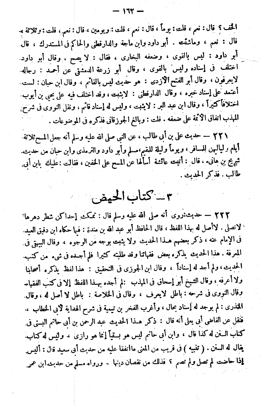 221 - حديث علي بن أبي طالب عن النبي صلى الله عليه و سلم أنه جعل المسح ثلاثة أيام ولياليهن للمسافر ويوما وليلة للمقيم مسلم وأبو داود والترمذي وابن حبان من حديث شريح بن هانئ قال أتيت عائشة أسألها عن المسح على الخفين فقالت عليك بابن أبي طالب فذكر الحديث