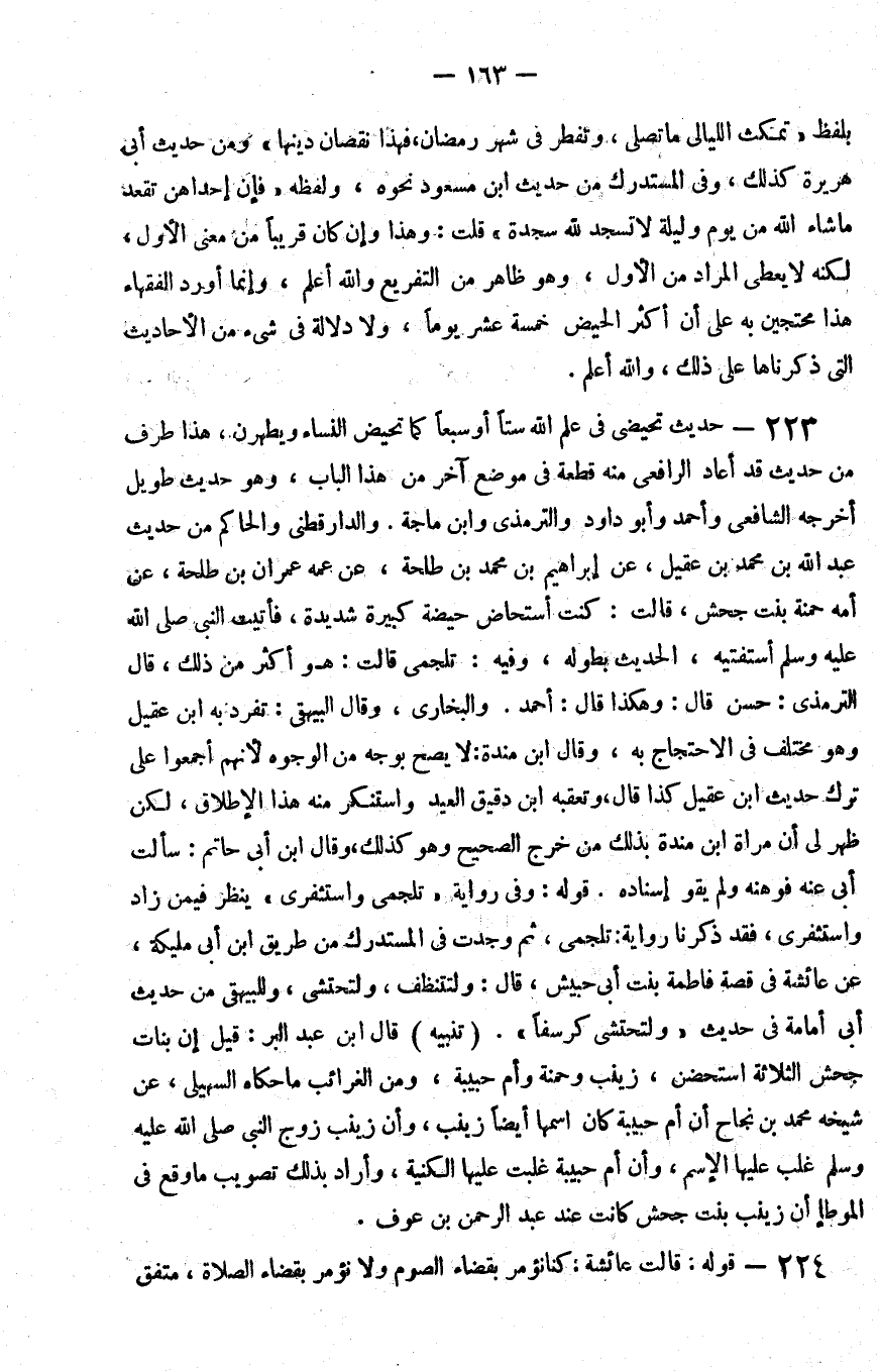 223 - حديث تحيضي في علم الله ستا أو سبعا كما تحيض النساء ويطهرن هذا طرف من حديث قد أعاد الرافعي منه قطعة في موضع آخر من هذا الباب وهو حديث طويل أخرجه الشافعي وأحمد وأبو داود والترمذي وابن ماجة والدارقطني والحاكم من حديث عبد الله بن محمد بن عقيل عن إبراهيم بن محمد بن طلحة عن عمه عمران بن طلحة عن أمه حمنة بنت جحش قالت كنت أستحاض حيضة كبيرة شديدة فأتيت النبي صلى الله عليه و سلم أستفتيه الحديث بطوله وفيه تلجمي قالت هو أكثر من ذلك قال الترمذي حسن قال وهكذا قال أحمد والبخاري وقال البيهقي تفرد به بن عقيل وهو مختلف في الاحتجاج به وقال بن مندة لا يصح بوجه من الوجوه لأنهم أجمعوا على ترك حديث بن عقيل كذا قال وتعقبه بن دقيق العيد واستنكر منه هذا الإطلاق لكن ظهر لي أن مراة بن مندة بذلك من خرج الصحيح وهو كذلك وقال بن أبي حاتم سألت أبي عنه فوهنه ولم يقو إسناده قوله وفي رواية تلجمي واستثفري ينظر فيمن زاد واستثفري فقد ذكرنا رواية تلجمي ثم وجدت في المستدرك من طريق بن أبي مليكة عن عائشة في قصة فاطمة بنت أبي حبيش قال ولتتنظف ولتحتشي وللبيهقي من حديث أبي أمامة في حديث ولتحتشي كرسفا