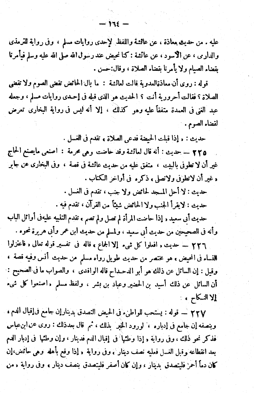 225 - حديث أنه قال لعائشة وقد حاضت وهي محرمة اصنعي ما يصنع الحاج غير أن لا تطوفي بالبيت متفق عليه من حديث عائشة في قصة وفي البخاري عن جابر غير أن لا تطوفي ولا تصلي ذكره في أواخر الكتاب