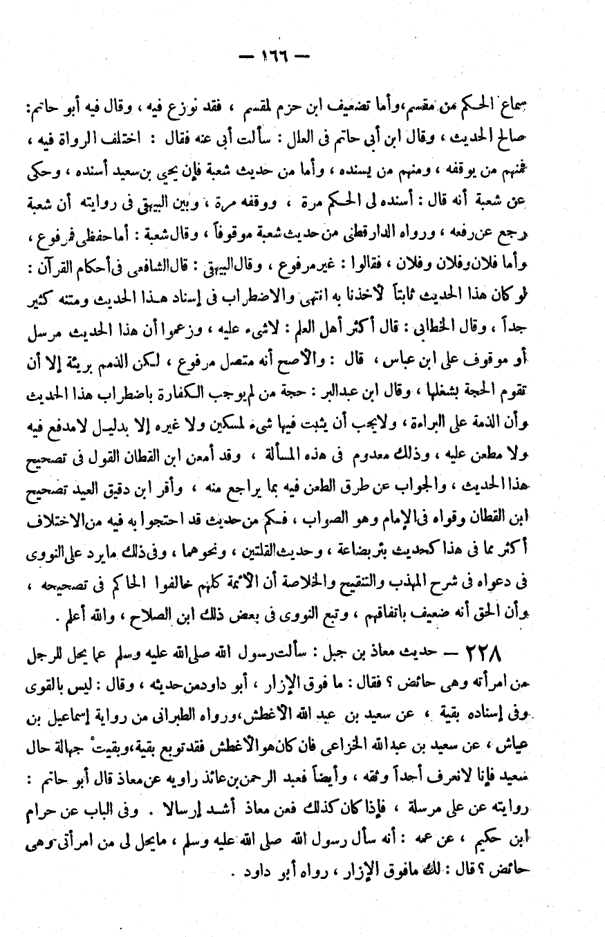 228 - حديث معاذ بن جبل سألت رسول الله صلى الله عليه و سلم عما يحل للرجل من امرأته وهي حائض فقال ما فوق الإزار أبو داود من حديثه وقال ليس بالقوي وفي إسناده بقية عن سعيد بن عبد الله الأغطش ورواه الطبراني من رواية إسماعيل بن عياش عن سعيد بن عبد الله الخزاعي فان كان هو الأغطش فقد توبع بقية وبقيت جهالة حال سعيد فإنا لا نعرف أحدا وثقه وأيضا فعبد الرحمن بن عائذ راويه عن معاذ قال أبو حاتم روايته عن علي مرسلة فإذا كان كذلك فعن معاذ أشد إرسالا وفي الباب عن حرام بن حكيم عن عمه أنه سأل رسول الله صلى الله عليه و سلم ما يحل لي من امرأتي وهي حائض قال لك ما فوق الإزار رواه أبو داود
