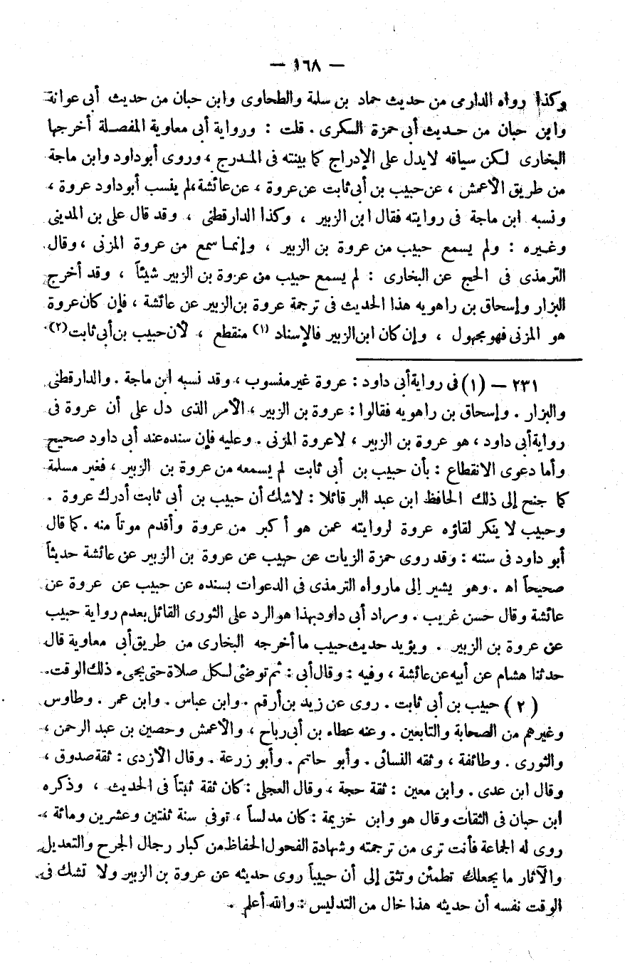 وكذا رواه الدارمي من حديث حماد بن سلمة والطحاوي وابن حبان من حديث أبي عوانة وابن حبان من حديث أبي حمزة السكري قلت ورواية أبي معاوية المفصلة أخرجها البخاري لكن سياقه لا يدل على الإدراج كما بينته في المدرج وروى أبو داود وابن ماجة من طريق الأعمش عن حبيب بن أبي ثابت عن عروة عن عائشة لم ينسب أبو داود عروة ونسبه بن ماجة في روايته فقال بن الزبير وكذا الدارقطني وقد قال علي بن المديني وغيره ولم يسمع حبيب من عروة بن الزبير وإنما سمع من عروة المزني وقال الترمذي في الحج عن البخاري لم يسمع حبيب من عروة بن الزبير شيئا وقد أخرج البزار وإسحاق بن راهويه هذا الحديث في ترجمة عروة بن الزبير عن عائشة فإن كان عروة هو المزني فهو مجهول وإن كان بن الزبير فالإسناد 1 منقطع لأن حبيب بن أبي ثابت
