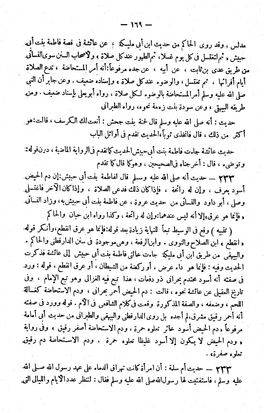 232 - حديث أنه صلى الله عليه و سلم قال لفاطمة بنت أبي حبيش إن دم الحيض أسود يعرف وإن له رائحة فإذا كان ذلك فدعي الصلاة وإذا كان الآخر فاغتسلي وصلي أبو داود والنسائي من حديث عروة عن فاطمة بنت أبي حبيش به وزاد النسائي فإنما هو عرق إلا أنه ليس عندهما وإن له رائحة وكذا رواه بن حبان والحاكم