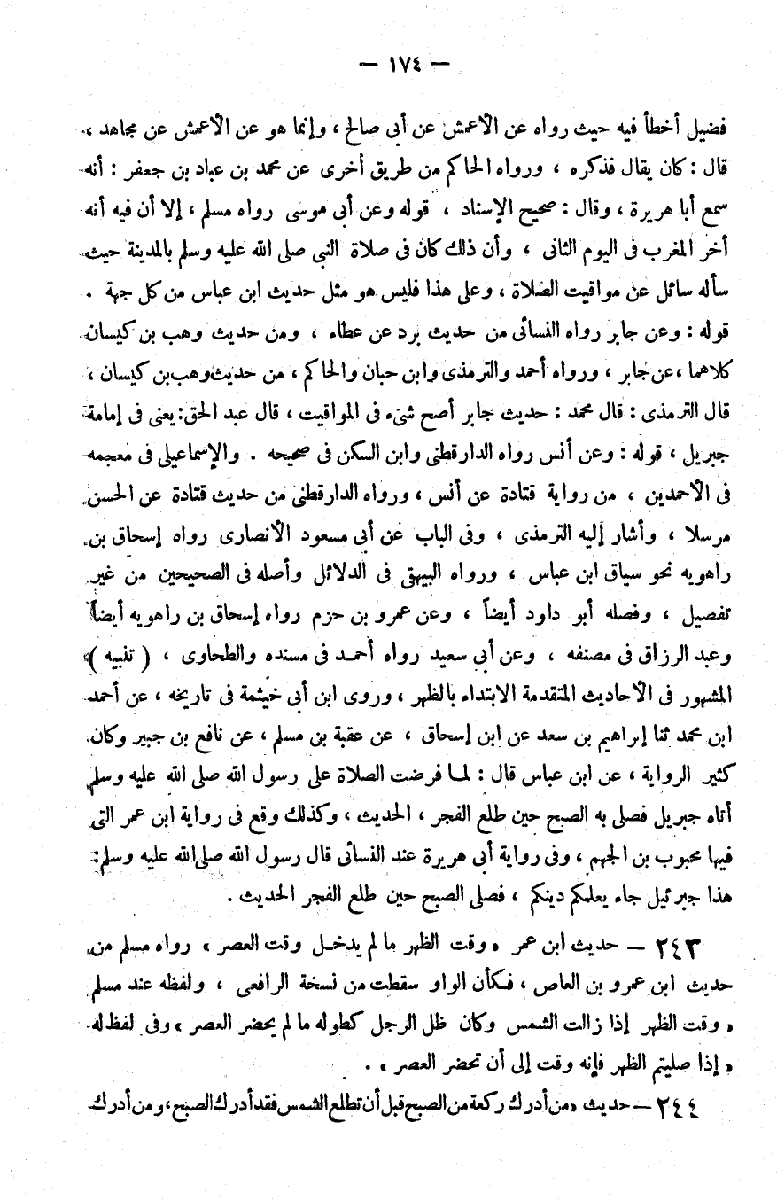243 - حديث بن عمر وقت الظهر ما لم يدخل وقت العصر رواه مسلم من حديث بن عمرو بن العاص فكأن الواو سقطت من نسخة الرافعي ولفظه عند مسلم وقت الظهر إذا زالت الشمس وكان ظل الرجل كطوله ما لم يحضر العصر وفي لفظ له إذا صليتم الظهر فإنه وقت إلى أن تحضر العصر